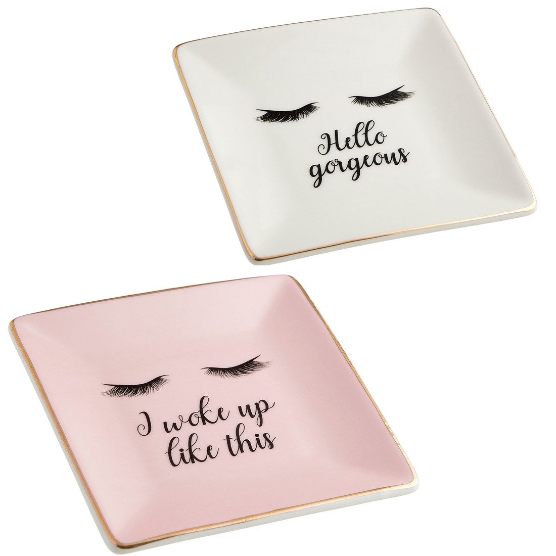 Entdecken Sie die Eleganz und den subtilen Charme unserer exklusiven Keramikschalen, die in den Farbtönen Weiß und Rosé erhältlich sind. Jede Schale zeichnet sich durch eine quadratische Form mit einem fein gearbeiteten Goldrand aus, der einen Hauch von Luxus verleiht. In der Mitte prangen jeweils ein paar lange, volle Wimpern – ein Symbol für Schönheit und Anmut.