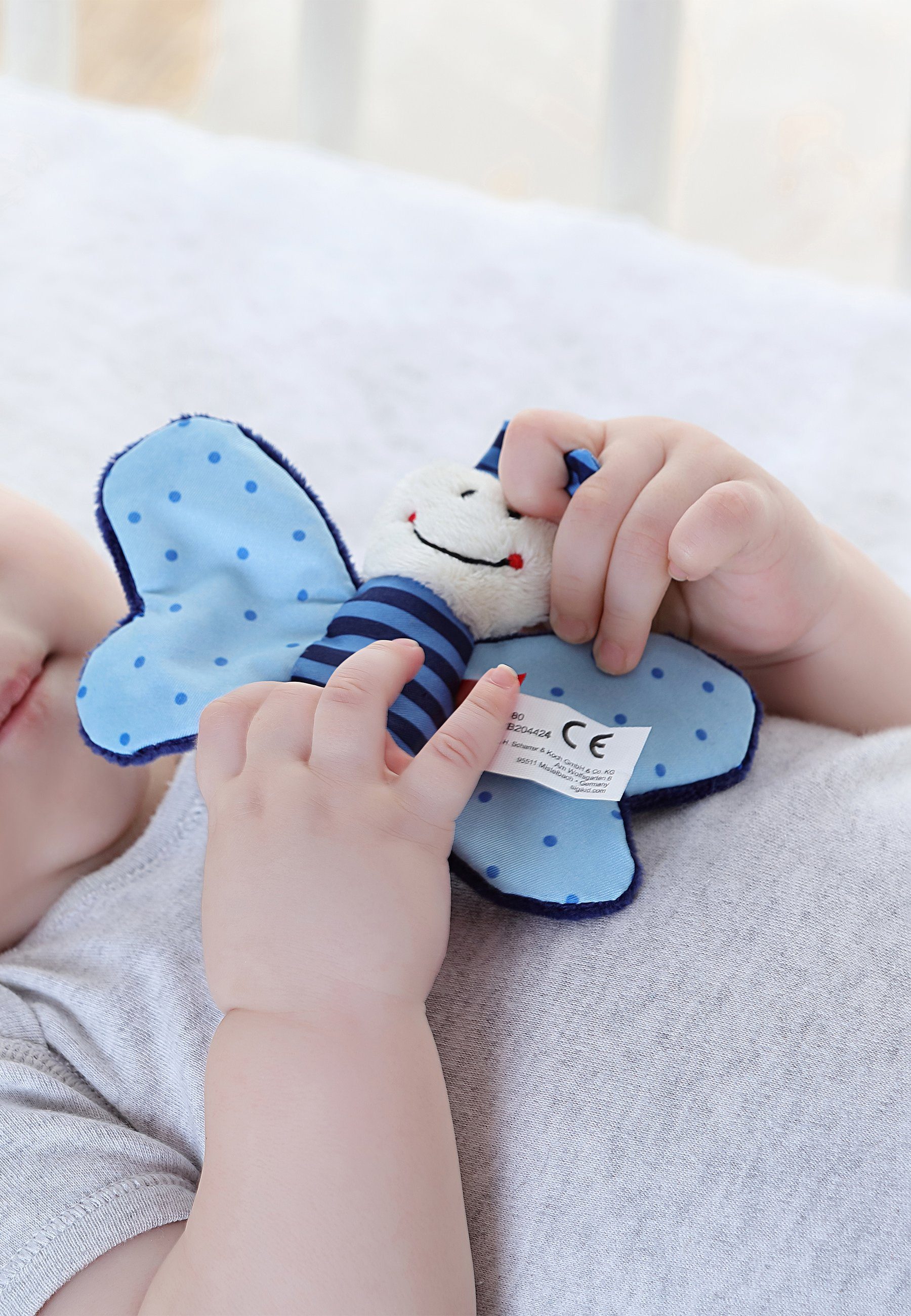 Ein Greifling ist eines der ersten Spielzeuge, die ein Baby in den Händen hält. Umso wichtiger sind weiche, griffige Materialien, einfache Haptik sowie optische und akustische Reize. Die farbenfrohen, kindgerechten RED STARS vereinen all diese Eigenschaften und machen sie daher so beliebt. Der Schmetterling mit einer Размер von ca. 9 cm ist das perfekte Spielzeug für die ersten Wachphasen des Babys und trägt dazu bei, die motorischen Fähigkeiten des Kindes zu entwickeln. Der Rassel-Greifling ist bewusst so dimensioniert, dass bereits kleine Babyhände das Spielzeug sehr gut umgreifen und festhalten können. Der kleine Schmetterling aus weichem Microplüsch und gemustertem Polyesterstoff hat ein freundliches, gesticktes Gesicht und ist bereit, mit allen Sinnen erforscht zu werden. Ein besonderer Spaß ist die eingebaute Rassel - eine klasse Belohnung für erfolgreiche Greifversuche. Die sorgfältig ausgewählten Materialien sind hochwertig verarbeitet und halten auch häufiger Wäsche bei 30° in der Waschmaschine stand. Empfohlen wird das Greifspielzeug ab der Geburt bis zum 12. Lebensmonat. sigikid legt besonderen Wert auf ausgesuchte Materialien und durchdachtes Design. Um die Sicherheit unserer Produkte zu gewährleisten, werden von akkreditierten Prüfinstituten regelmäßig Prüfungen gemäß dem aktuell geltenden (europäischen) Recht durchgeführt. Die Marke sigikid steht für kuschelige Produkte, die Emotionen wecken und Eltern und Kindern gleichermaßen ein gutes Gefühl vermitteln. Seit über 55 Jahren folgt sigikid einem klaren Leitsatz: FIRST CLASS FOR KIDS! Wir machen die Welt für Familien von Anfang an kuscheliger und bunter.