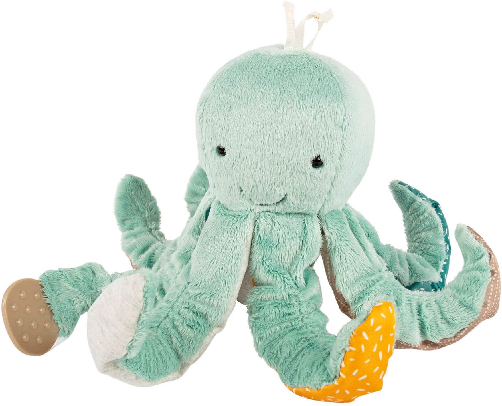 sigikid yellow – the sunshine collection – steht für eine moderne und harmonische Farbzusammenstellung. Die Kollektion ist typisch sigikid: positiv und voller Lebensfreude! Der Aktiv-Krake ist ein echter Allrounder für Babys von 0 bis 12 Monaten: Babyspielzeug und Kuscheltier in einem. Die in den Tentakeln versteckten Funktionen wie Knisterfolie, Quietsche und Rassel motivieren das Baby das Plüschtier mit allen Sinnen zu erforschen und dabei seine motorischen Fähigkeiten zu entwickeln. Mit dem Aktiv-Spielzeug kommt keine Langeweile auf, es animiert hingegen das Kind zum aktiven Greifen, Fühlen, Hören. Mit dem Folien-Spiegel, welcher per Klett am Bauch des Oktopusses befestigt ist, kann das Baby sich selbst entdecken. Am Ende eines Tentakels befindet sich eine Beißfläche. Diese wird von Babys gerne in den Mund genommen und kann für Linderung sorgen, wenn die ersten Zähnchen wachsen. sigikid legt besonderen Wert auf ausgesuchte Materialien, durchdachtes Design und Sicherheit. Die Kunststoffaugen sind mit Sperrscheiben auf der Rückseite fixiert. Um die Befestigung zu bestätigen, wird ein Zugtest durchgeführt. Dabei wird per Zuggerät für 10 Sekunden gezogen und somit die korrekte Fixierung bestätigt. Das anschmiegsame Meerestier ist mit hygienischer Polyesterwatte gefüllt. Die weichen Stoffe sind hochwertig verarbeitet und halten auch häufiger Wäsche bei 30 °C in der Waschmaschine stand. Der Spiegel sollte zuvor entfernt werden. Um die Sicherheit unserer Produkte zu gewährleisten, werden von akkreditierten Prüfinstituten regelmäßig Prüfungen gemäß dem aktuell geltenden (europäischen) Recht durchgeführt. Die Marke sigikid steht für kuschelige Produkte, die Emotionen wecken und ein gutes Gefühl vermitteln, sowohl bei den Eltern als auch bei ihren Kindern. Seit 55 Jahren folgt sigikid einem klaren Leitsatz: FIRST CLASS FOR KIDS! Wir machen die Welt für Familien von Anfang an kuscheliger und bunter.