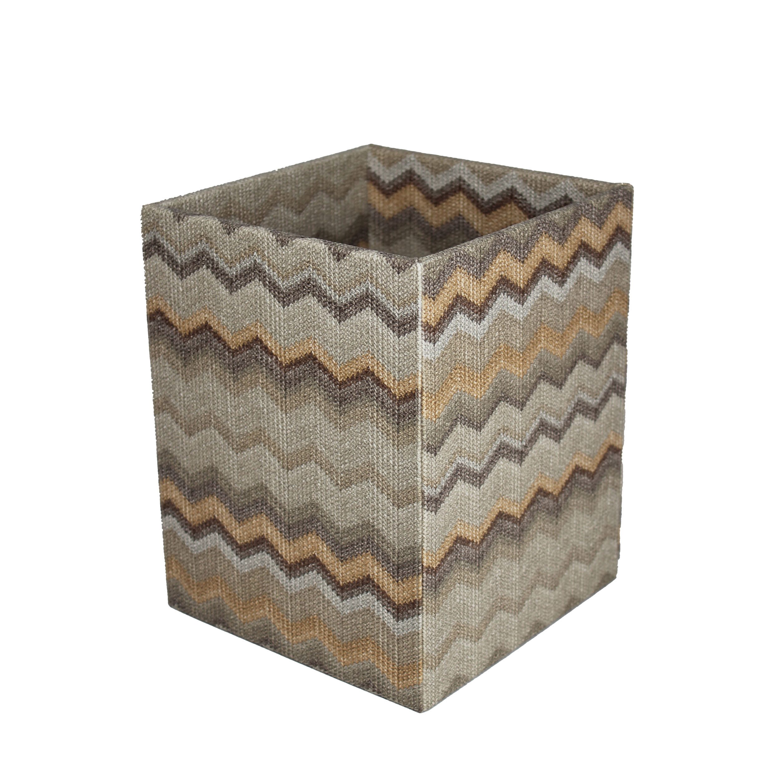 Edel, basic und praktisch noch dazu - der eckige Papierkorb mit auffälligem Zickzack Muster in Farbe braun, grau & ocker, verdient einen Platz in Ihrem Wohnzimmer oder Büro. Das beschichtete Gewebe ist unempfindlich gegen Wasser und Schmutz. Solide Handarbeit garantiert dabei die inneren Werte - nämlich höchste Qualität. Wir legen großen Wert auf Qualität. Daher werden die quadratischen Abfalleimer innerhalb Europas in Handarbeit gefertigt.