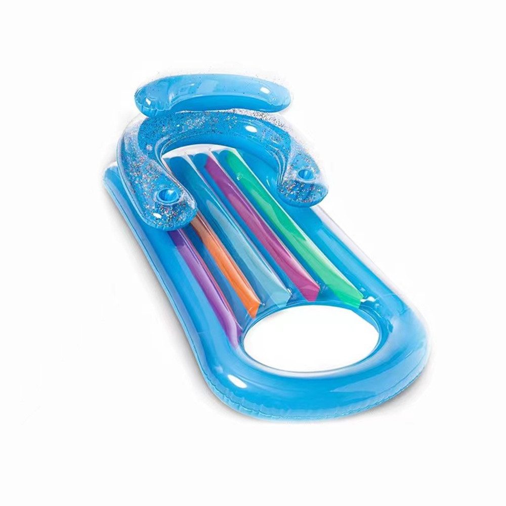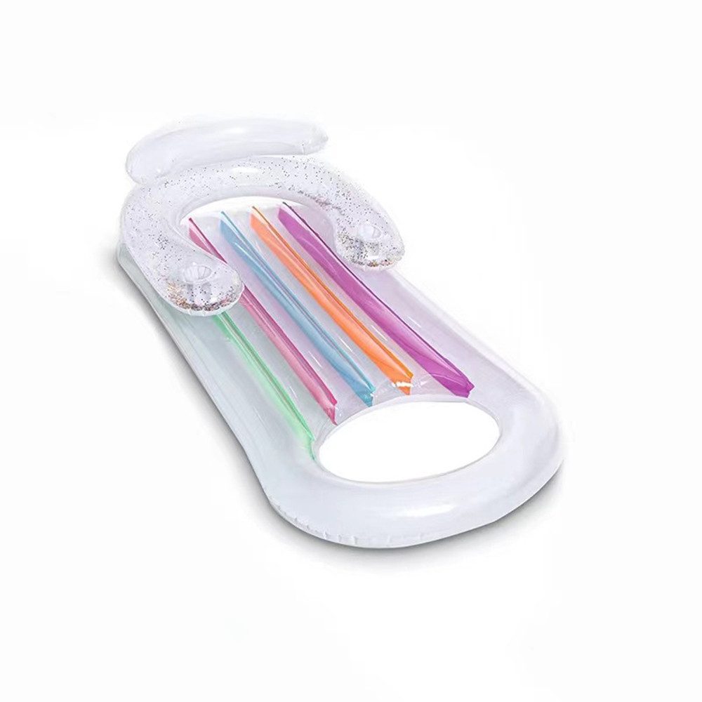 Genießen Sie den Sommer mit dieser farbenfrohen, aufblasbaren Luftmatratze mit bequemer Rückenlehne und funkelndem Glitzer-Design. Die ergonomisch geformte Liegefläche mit integrierter Armstütze bietet höchsten Komfort auf dem Wasser – egal ob im Pool, am Strand oder am See. Dank der offenen Beinaussparung können Sie Ihre Füße ins Wasser tauchen und sich gleichzeitig entspannt treiben lassen. Aus robustem PVC gefertigt, ist die Luftmatratze langlebig, leicht aufblasbar und einfach zu transportieren – perfekt für Urlaub, Garten oder Badeausflug.