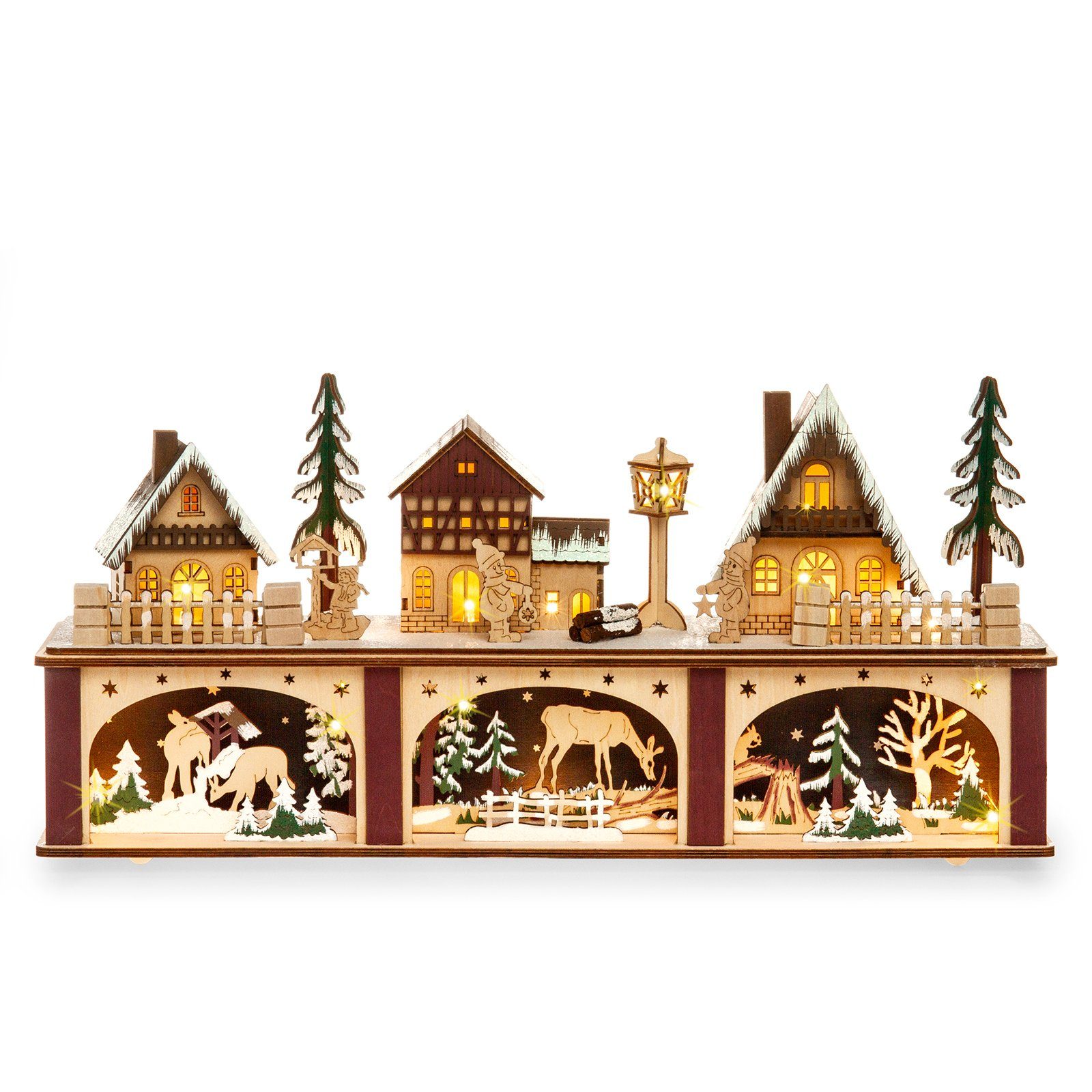 Wundervoller, in liebevoller Handarbeit aufwändig gestalteter Lichtersockel aus Holz mit stromsparender LED Beleuchtung. Besonders reizvoll dekoriert mit 3 von innenbeleuchteten Häuschen, einer beleuchteten Laterne und einer detailreich gestalteten Winter Waldszene im ebenfalls beleuchteten Sockel. Sie können dieses wirklich einzigartige Weihnachtsdeko sowohl mit Hilfe von Batterien betreiben als auch mit einem passenden Trafo (nicht im Lieferumfang enthalten) an das Stromnetz anschließen. Somit müssen Sie auch im Ferienhaus, Wohnmobil oder sonstigen Orten ohne Stromanschluss nicht auf Ihre bezaubernde Weihnachtsdeko verzichten. Maße ca. L45xB11xH22 cm. SIKORA Weihnachtswelt.