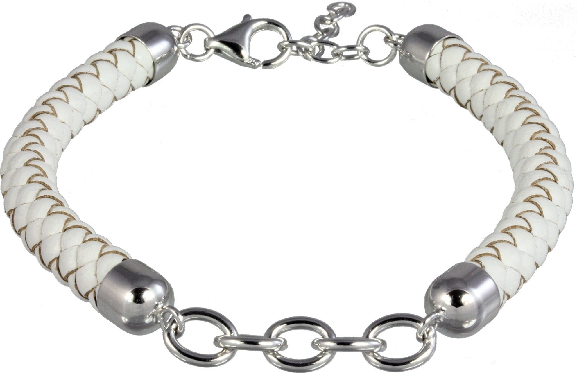 Geflochtenes, weißes Lederarmband, 18cm lang, plus einer 2,5cm Verlängerungskette. Aus 925er Sterlingsilber wurden die Kettenglieden gefertigt und das Armband aus geflochtenem Rindsleder. Eine Kette, an welche man unterschiedliche Charms befestigen kann, befindet sich mittig im Armbandes.
