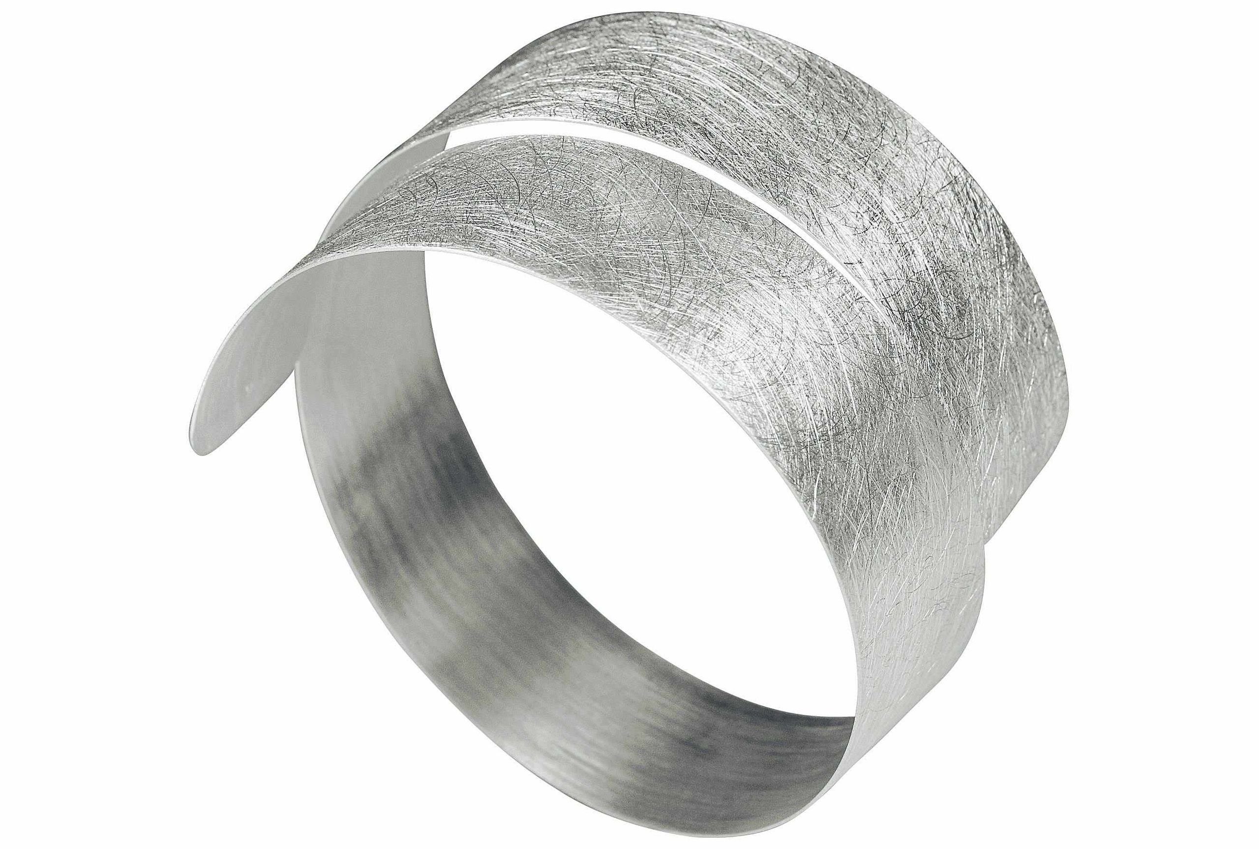 Dieser außergewöhnlich gearbeitete Armreif gewährleistet durch seine gefederte und spiralförmige Art höchsten Tragekomfort. Der Armreif springt beim Anziehen durch seine Flexibilität immer in seine urspüngliche Form zurück. Die Innenseite ist mattiert, die Außenseite gebürstet und die Kanten sind sanft abgerundet. Die besondere Ausstrahlung dieses Reifs wird vollendet durch seine eisgekratzte Oberfläche, die ihn mit einem Hauch kühler Raffinesse umgibt.