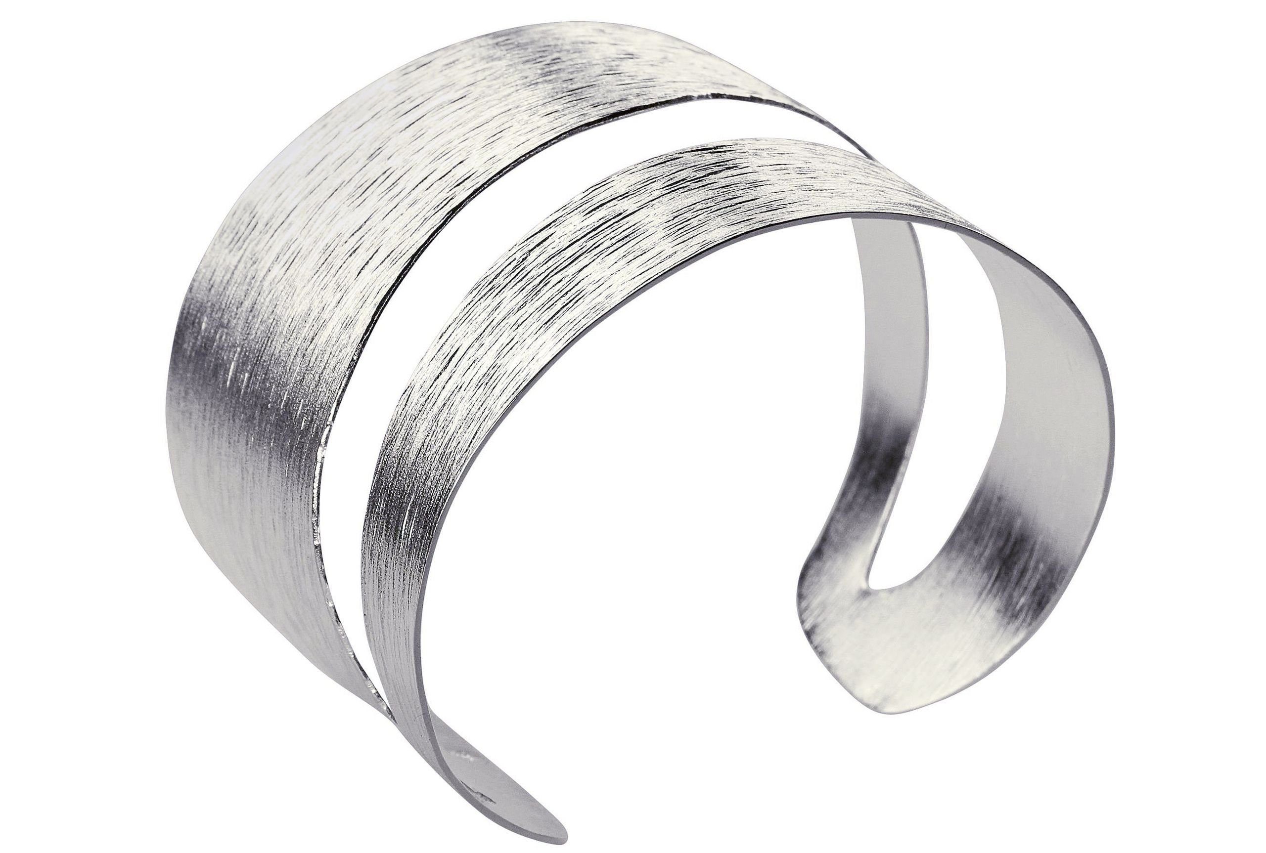 Hergestellt ist der schicke Armreif aus feinem 925er Sterlingsilber, das anlaufgeschützt ist. Ein besonderes Highlight bietet die glänzende Oberfläche: Hier wurde eine Struktur aus feinen Längsstreifen eingearbeitet. Der Kontrast zwischen streng wirkender Streifenstruktur und verspielter Diagonale erzeugt den optischen Reiz, der diesen extravaganten Schmuck auszeichnet.