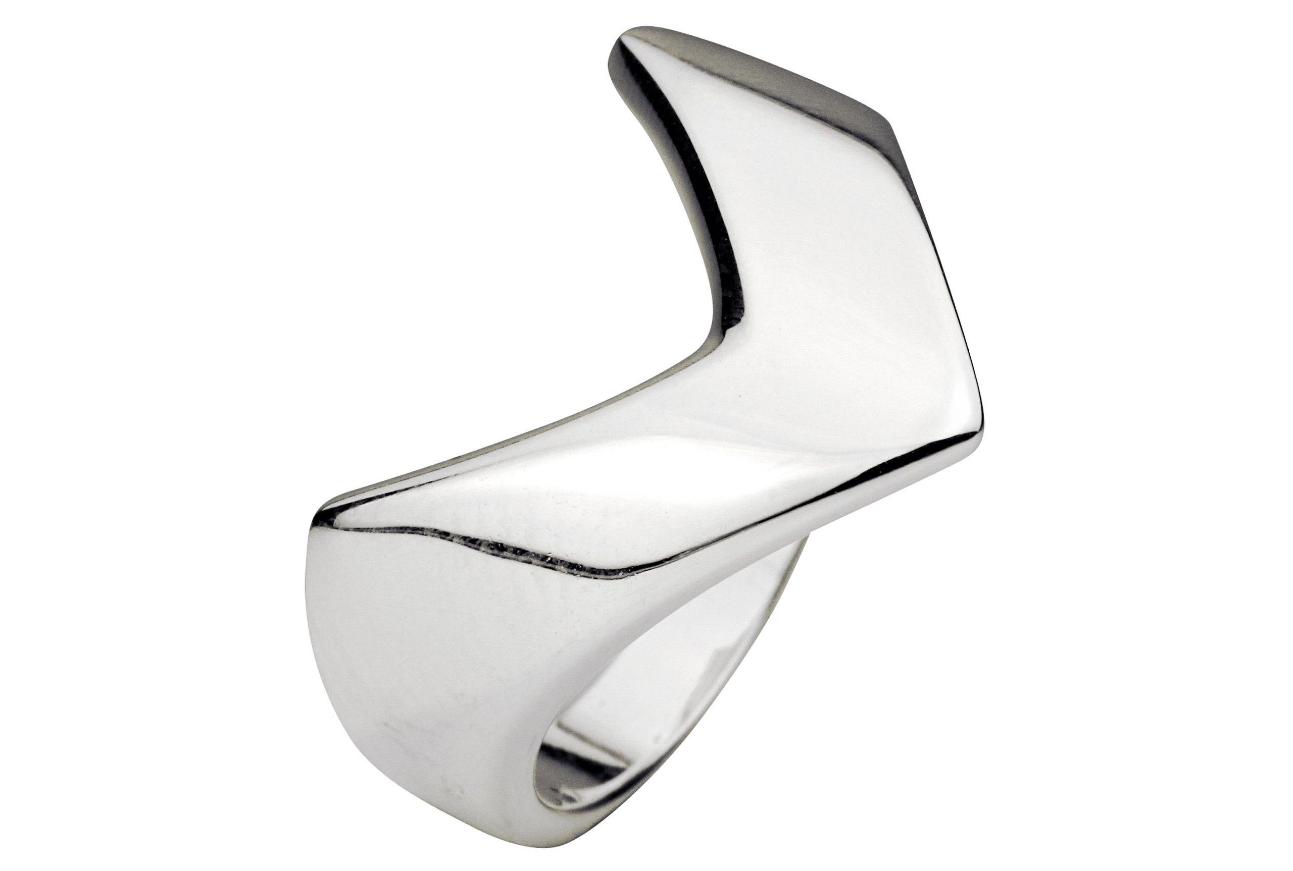 Dieser auffällige Ring mit Spitze punktet durch seine Geradlinigkeit: Im oberen Bereich wird die klassische Ringform aufgebrochen, denn hier geht das Schmuckstück nahtlos in eine klare V-Form über. Die Spitze zeigt in Richtung Fingernagel, wodurch sie den Blick des Betrachters geschickt nach vorne lenkt. Damit zaubert der Bandring optisch einen schlankeren Finger.