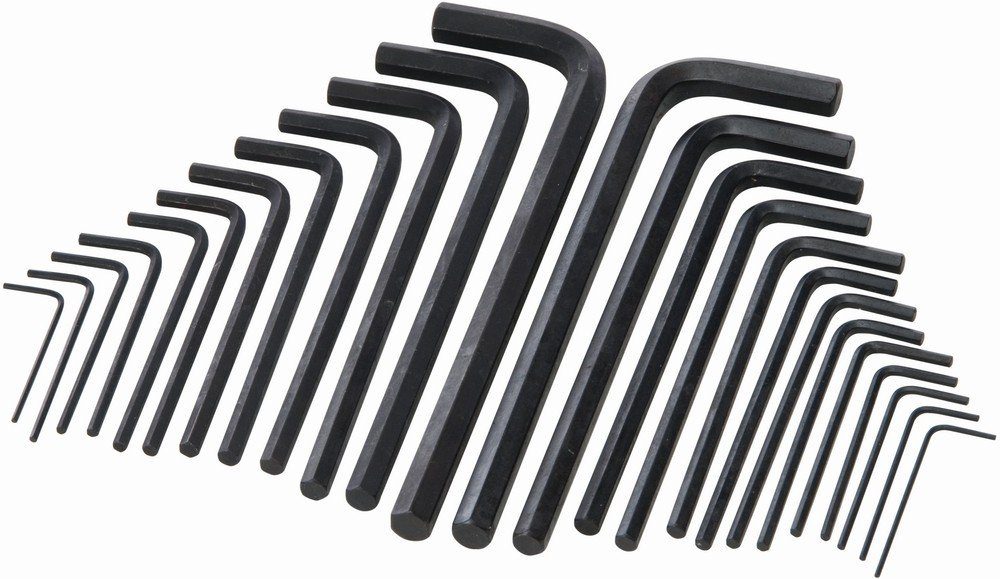 Chrom-Vanadium-Stahl. Satz an metrischen und zölligen Innensechskantschlüsseln. Lange Bauart. Inhalt: 12 lange, metrische und 13 lange, zöllige Sechskantschlüssel. Metrische Größen: 1,27, 1,5, 2, 2,5, 3, 3,5, 4, 4,5, 5 5,5, 6, 8 und 10 mm. Zöllige Größen: 1/20, 1/16, 5/64, 3/32, 7/64, 1/8, 5/32, 3/16, 7/32, ¼, 5/16 und 3/8 Zoll.