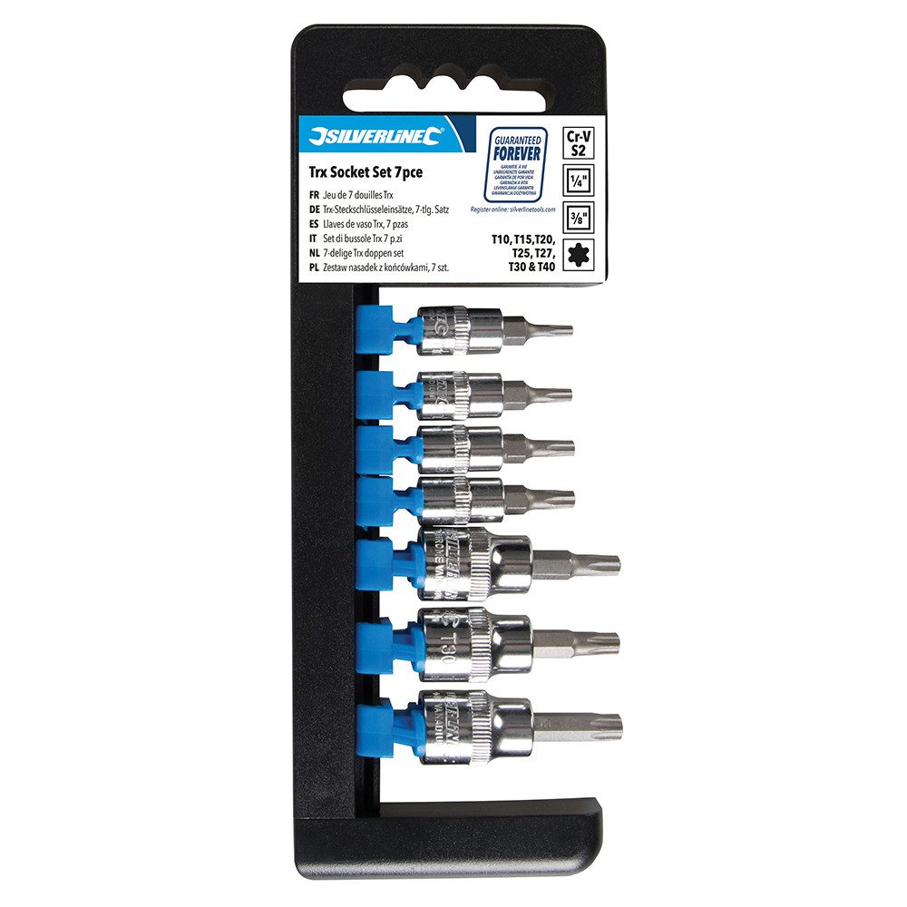 Vergütete, satinierte Trx-Bits in polierten Chrom-Vanadium-Steckschlüsseleinsätzen mit Vierkant-Antrieb.
