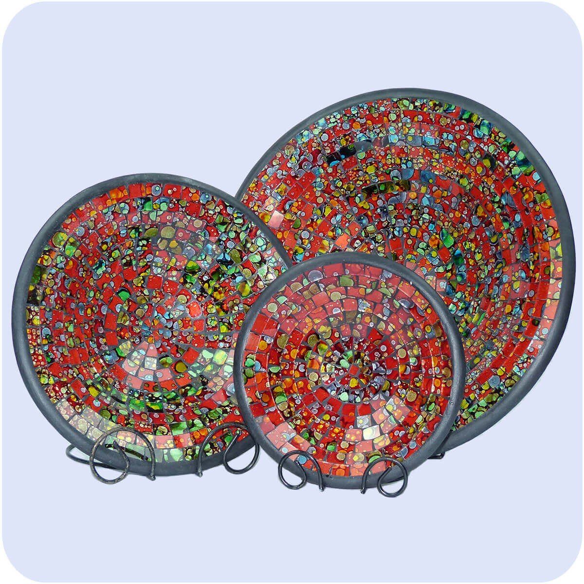 Die Schalen werden aus Ton getöpfert und gebrannt, im Anschluss, in faszinierenden Mustern mit kleinen farbigen Glas-Mosaiksteine beklebt und verfugt.