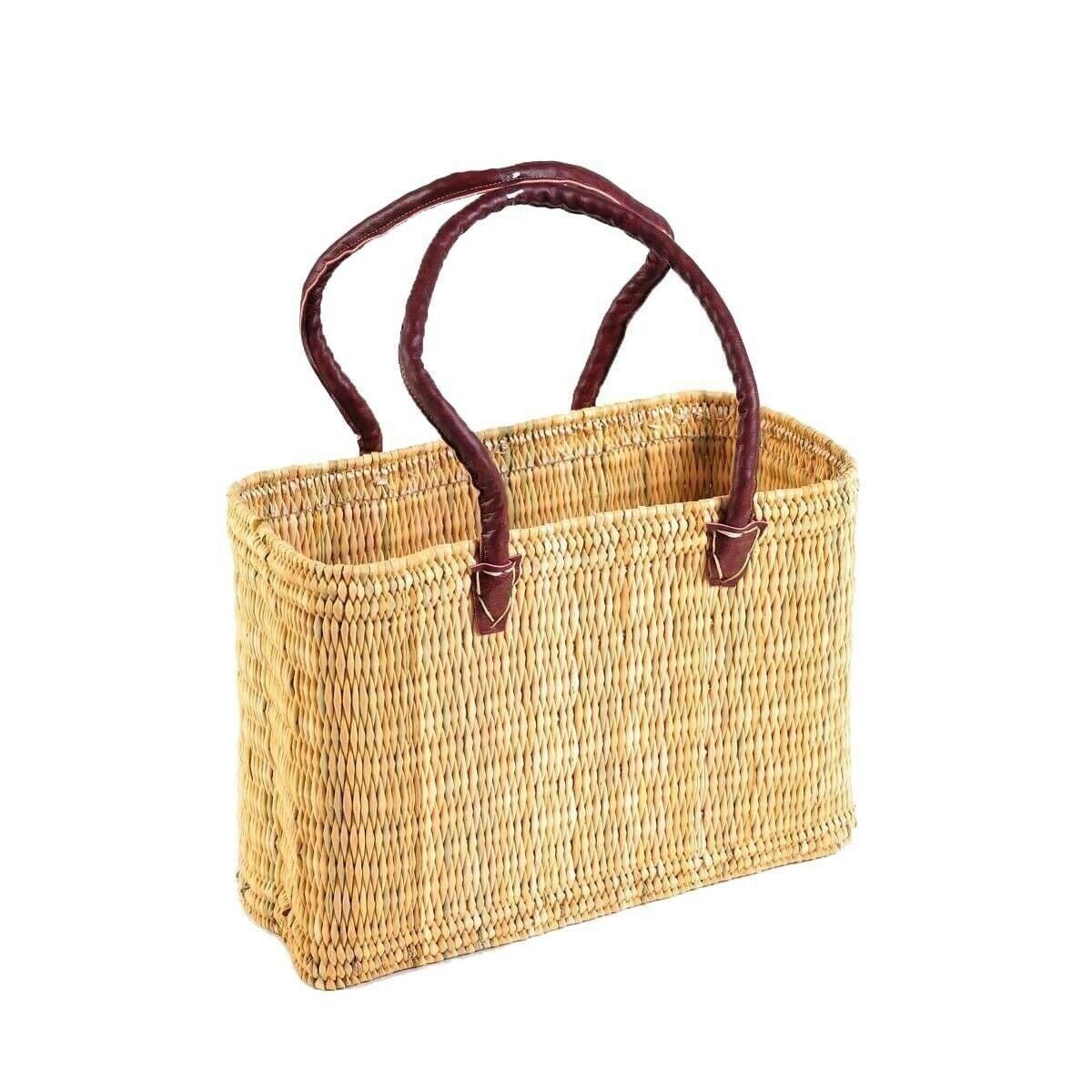 Dieser Korbtasche wurde in Marokko handgefertigt. Die Tasche verfügt über einen Leder-Trageriemen, der fest mit dem Korbgeflecht vernäht und vernietet ist.