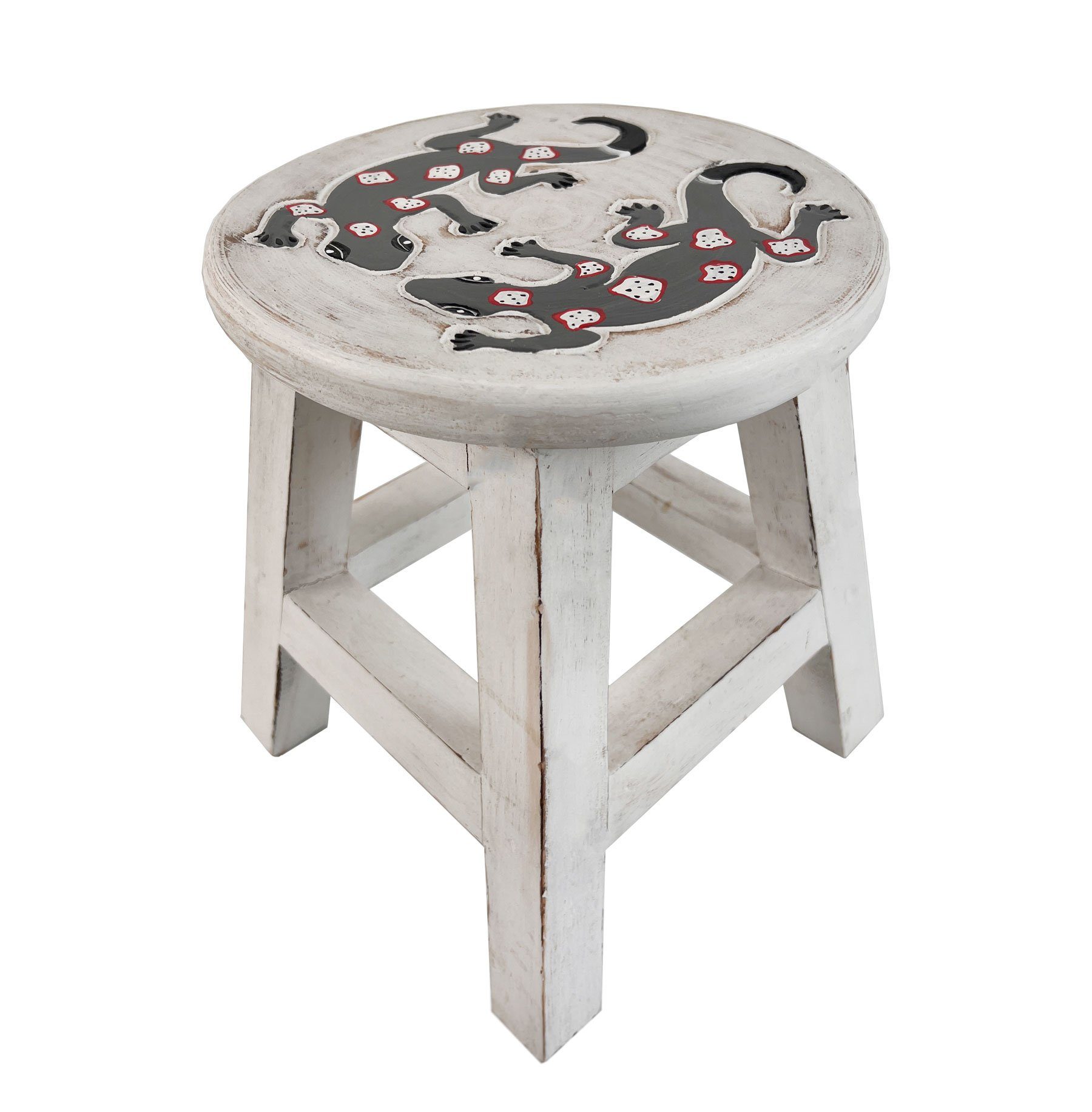 Unsere wunderschönen Holz Hocker zeigen verschiedenste Tiermotive wie Affe, Elefant, Eule, grüner Frosch, schwarzer Frosch, Gecko, Katze, Schildkröte die in das Holz geschnitzt und anschließend in Handarbeit sorgfältig bemalt wurden.