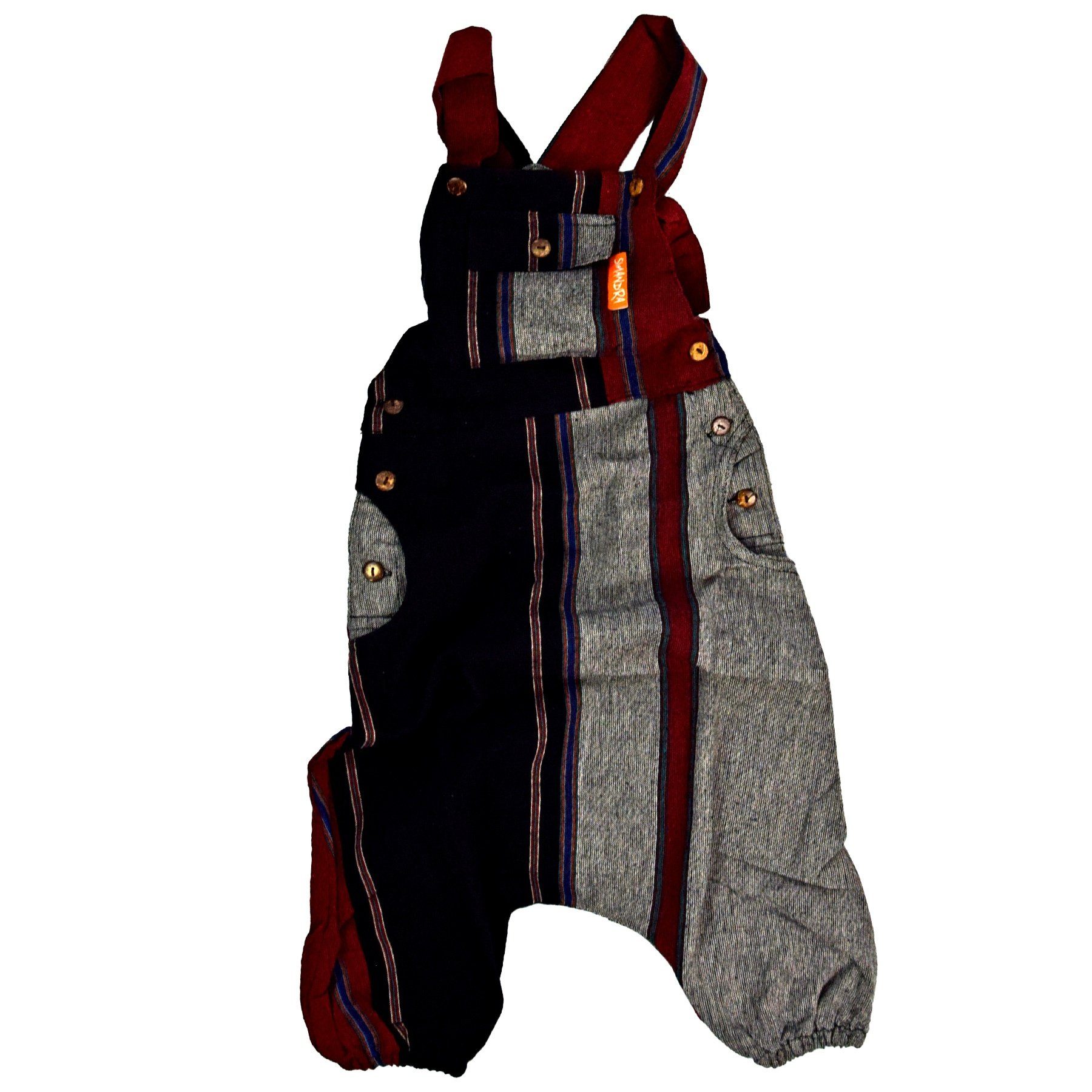 Unsere Kinder-Latzhose ist eine dreiviertellange Haremshose im Patchwork-Design und sowohl für Mädchen als auch Jungen geeignet. Die im Bein weit geschnittene und bequeme Hose im typischen Aladin-Stil ist durch 2 Trägerknöpfe am Latz in der Höhe stufenlos verstellbar. Durch den für Aladinhosen typischen Gummibund an den Beinen kann die Hose sowohl als knielange oder als kurze Hose getragen werden. Впередe Hingucker sind die 3 seitlichen Holzknöpfe und der besonders gestreifte Baumwollstoff der Kinderhose. Die Latzhose besitzt zwei große seitliche Eingrifftaschen und eine praktische Brusttasche am Latz, die separat mit einem Knopf geschlossen werden kann.