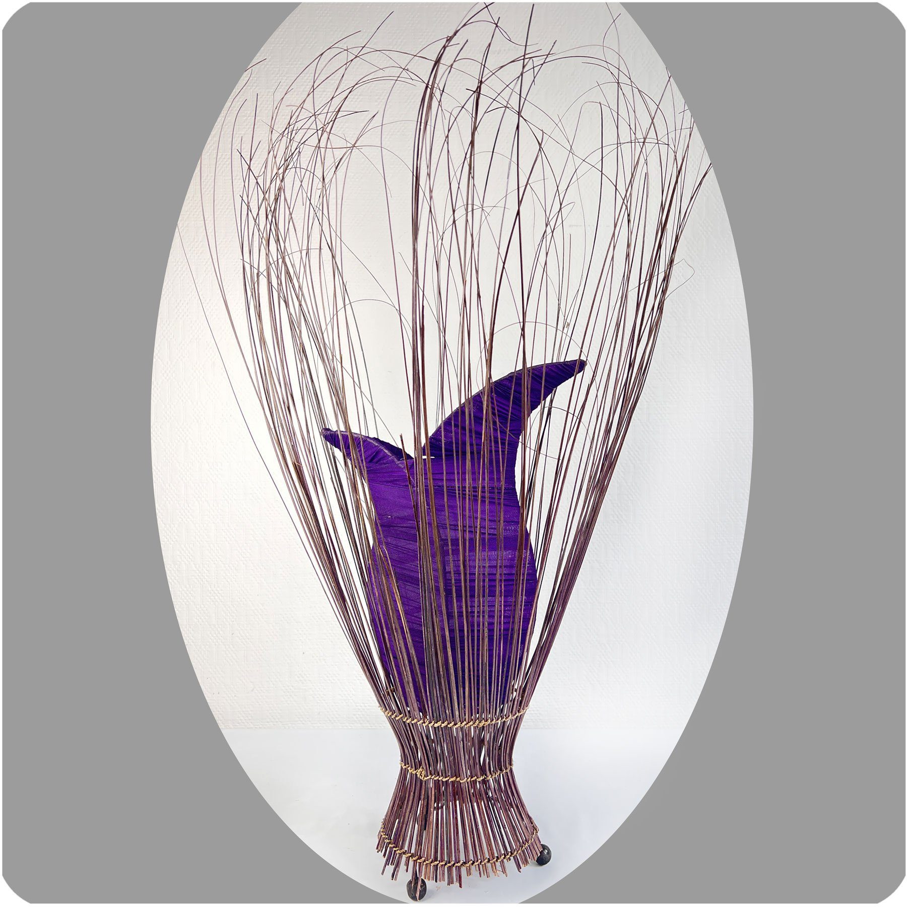 Die Bali Design Lampe Tulpe klein steht auf drei Metallfüßen, der Stoff wurde von Hand in einer sehr aufwendigen Falttechnik um den Metallrahmen gewickelt, so ergibt sich eine ungleichmäßige Struktur.