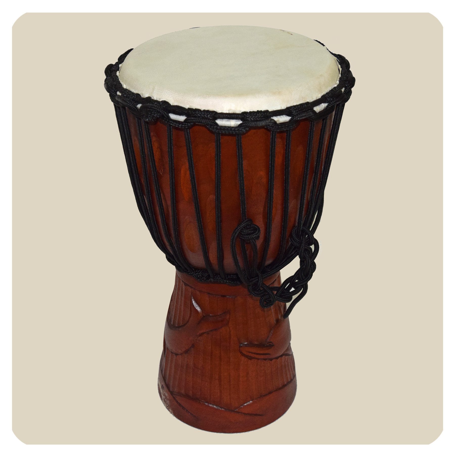 Unsere Djembe, auch Bongo oder Bongotrommel genannt, wurde von Hand gefertigt und ist mit wunderschönen Schnitzereien verziert.