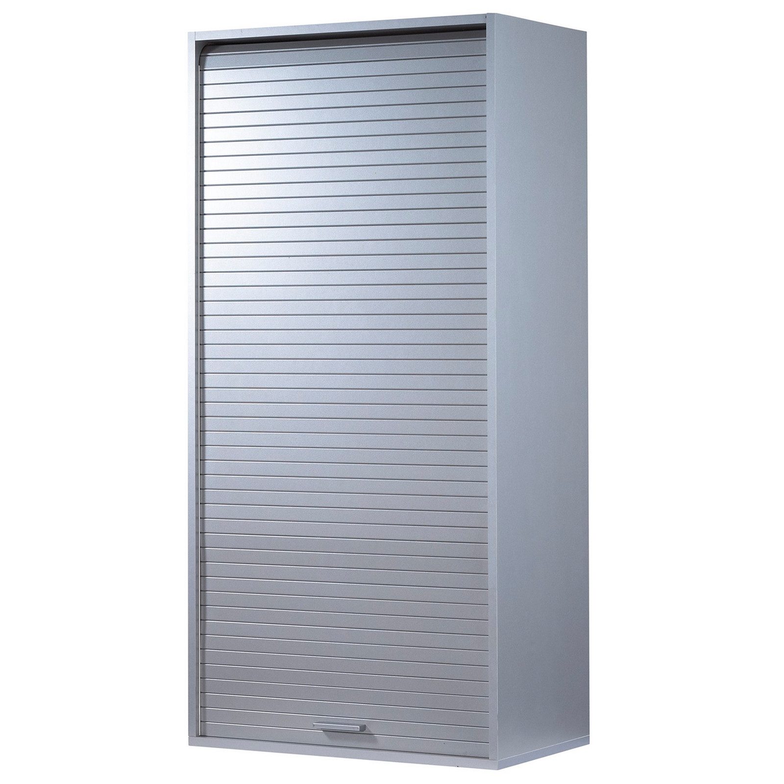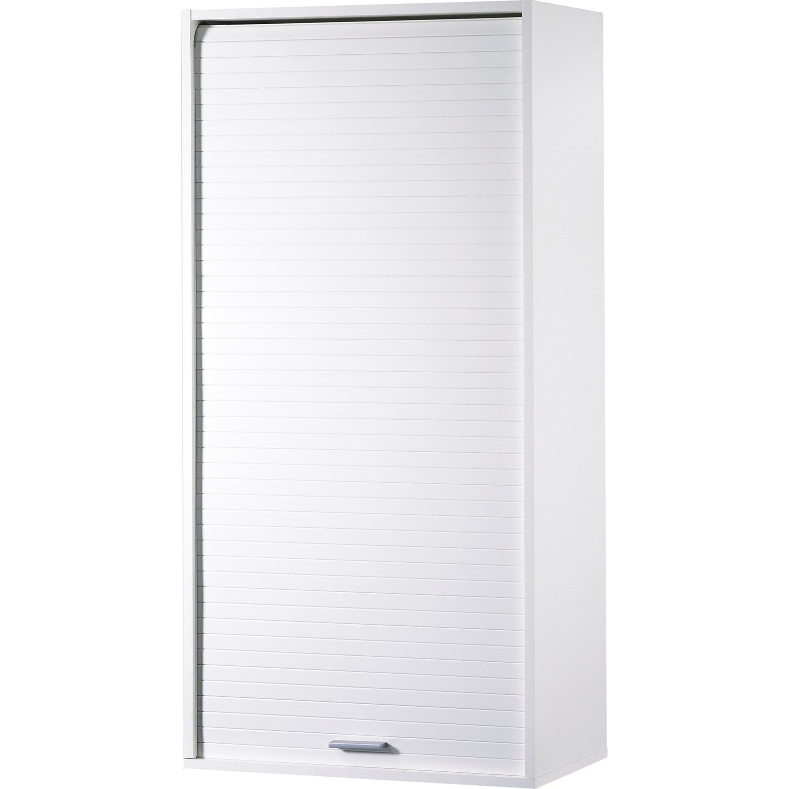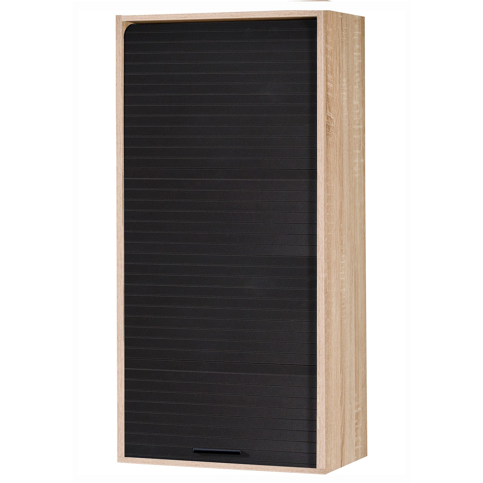 Küchenschrank mit Rollladen-Tür, kompatibel mit Standard-Küchensets. Die Struktur besteht aus einer 16mm Melamin-Spanplatten an beiden Seiten in der Qualität E0.5. Geschlossen wird der Schrank mit einer Rollladen-Tür (Tambour-Tür) aus einer 4 mm MDF-Platte diese verfügt über einen ABS-Kunststoffgriff. Zudem verfügt der Schrank über drei höhenverstellbaren Regalböden und kann an der Wand befestigt oder auf einer Oberfläche aufgestellt werden. Die Bodenplatte ist optional.