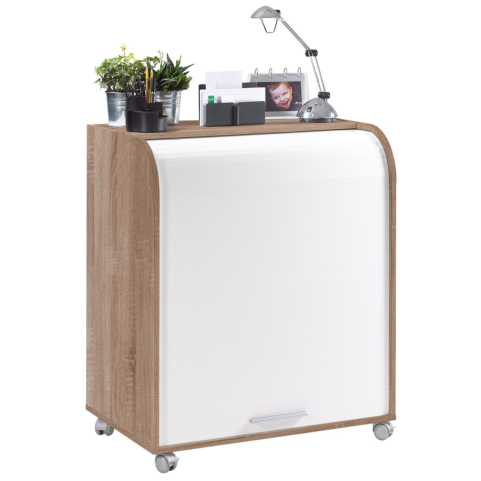 Dieses kompakte Multitalent bringt Ordnung und Stil in dein Arbeitszimmer. Dank der innovativen Rolltür kannst du deine Arbeitsfläche im Handumdrehen verschwinden lassen – perfekt für kleine Räume oder um den Feierabend zu genießen. Die höhenverstellbaren Regalböden bieten flexible Stauraumlösungen für Drucker, Ordner oder Büroaccessoires. Und mit dem abschließbaren Fach bleiben deine wichtigen Dokumente stets sicher verwahrt.