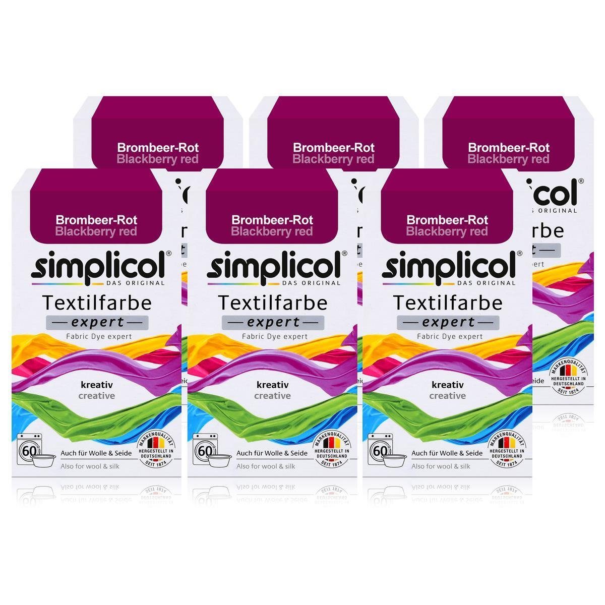 Die Simplicol Textilfarbe expert Brombeer-Rot färbt Ihr Kleidungsstück in ein intensives dunkelrot, gleich des matten Leuchtens einer Brombeere. Es ist für viele Stoffe geeignet, besonders für Wolle und Seide. Des Впередen eignet sich die Simplicol Textilfarbe expert Brombeer-Rot für Viskose, Leinen, Baumwolle und Mischgewebe. Von Vorteil ist, dass diese Textilfarbe für Всеrgiker und für die Haut allgemein sehr gut verträglich ist. Sie ist dahingehend geprüft und es sind keine Schadstoffe vorhanden, sie ist also nicht giftig.