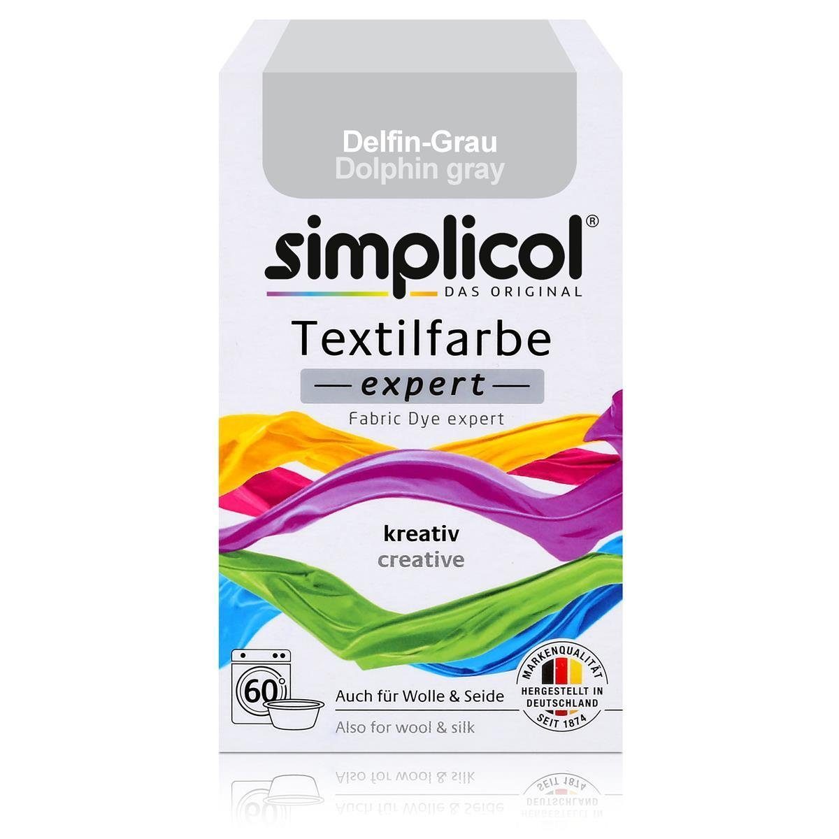 Simplicol Textilfarbe expert Delfin-Grau- so gelingt im Handumdrehen das FärbenHaben Sie sich schon mal am Färben von Stoffen versucht und waren mit dem Ergebnis nicht zufrieden? Dann seien Sie nicht besorgt, denn mit der Simplicol Textilfarbe expert Delfin-Grau wird Ihnen auch als Anfänger das Einfärben gelingen. Für große Wäschestücke können Sie einfach Ihre Waschmaschine verwenden. Geben Sie das Farbpulver mit den Textilien in die Waschtrommel und starten Sie einen Waschgang bei 60°C. Sie können im Anschluss die Stücke aus der Maschine entnehmen und die Farbe mit einem Fixierer behandeln. Das Ergebnis ist intensiv, gleichmäßig und lange haltbar.