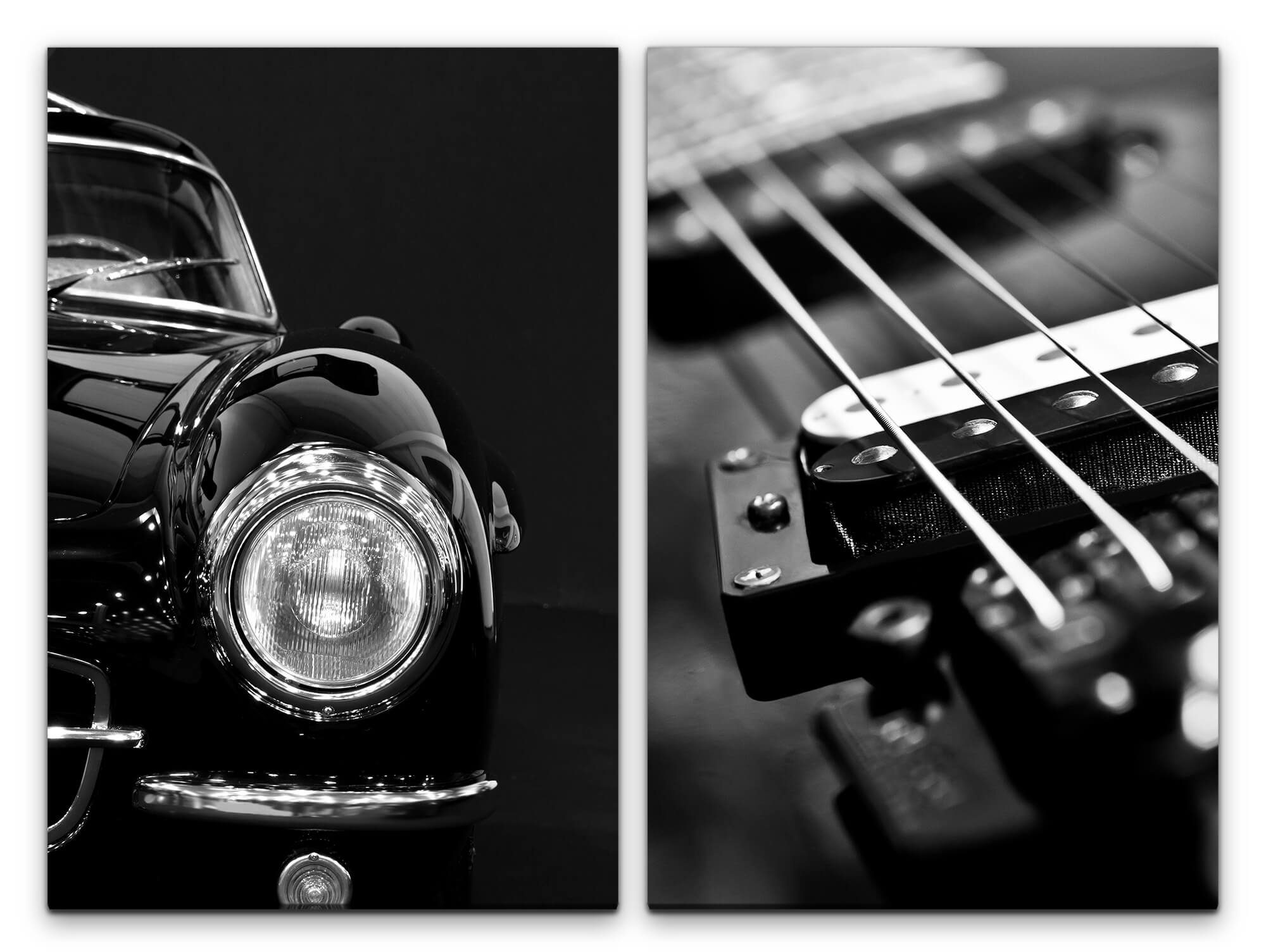 Sinus Art Leinwandbild 2 Bilder je 60x90cm Oldtimer Schwarz Klavierlack Scheinwerfer Traumauto Gitarrensaiten altes Auto