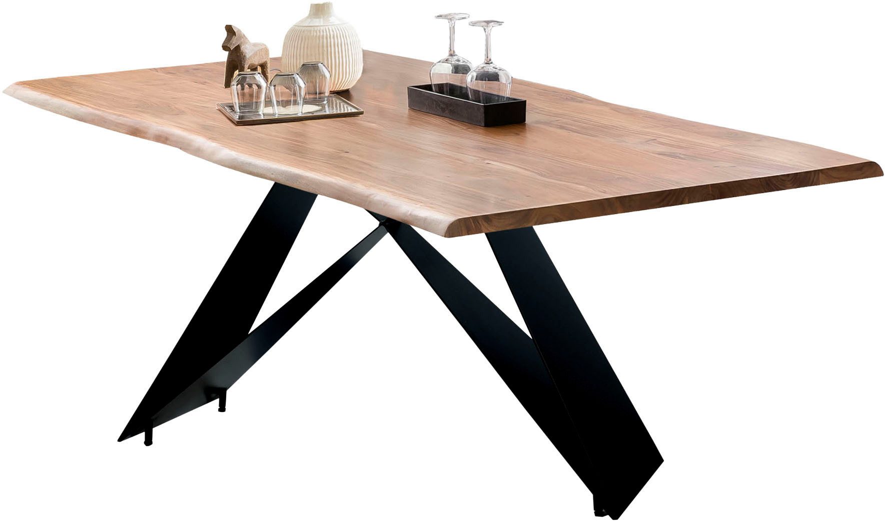 Wissenswertes | Gestell aus matt schwarz lackiertem Eisen Tischplatte Akazie massiv, gebeizt, lackiert und gewachst mit Baumkante wie gewachsen |
