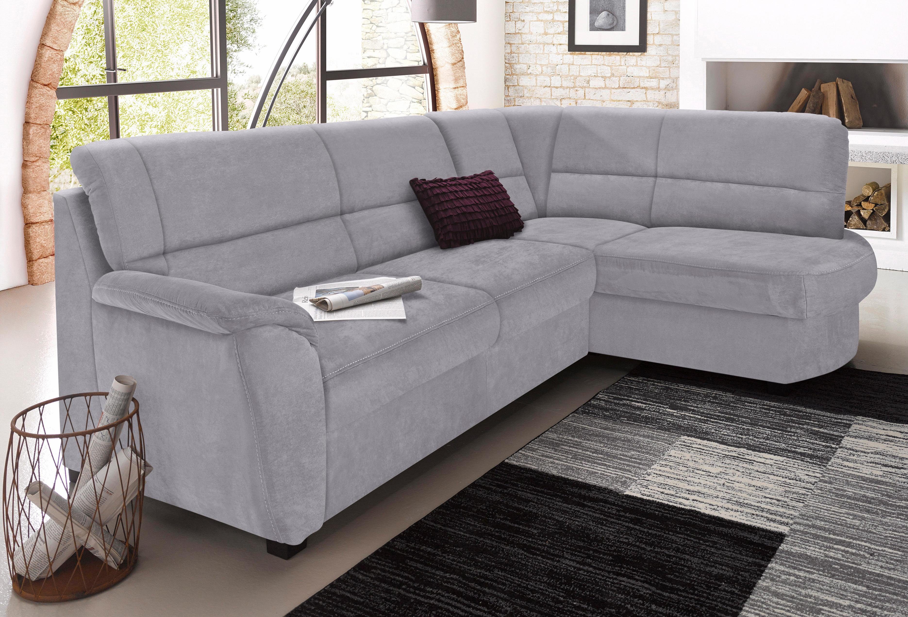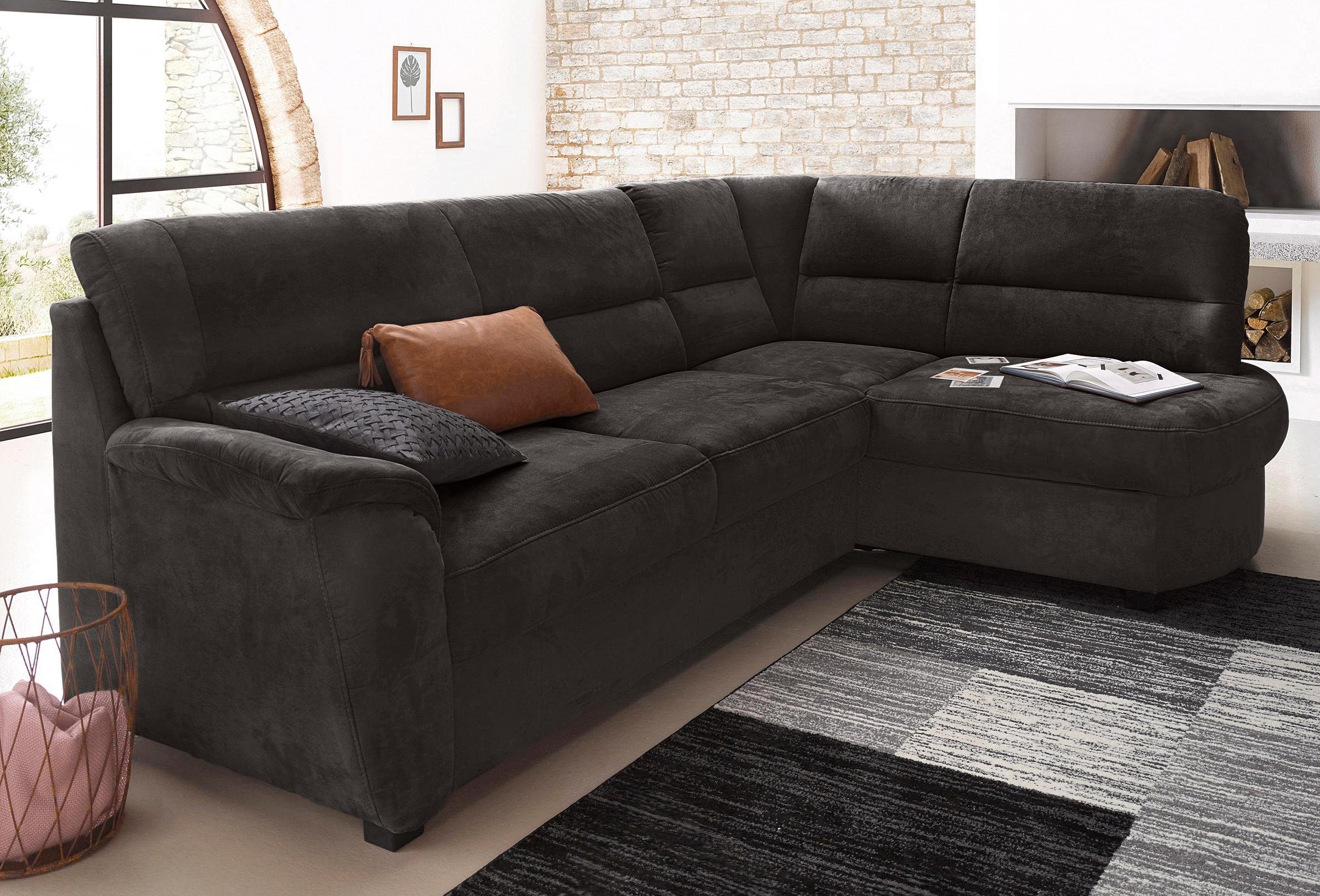 Durch die hochwertige Wellenunterfederung wird die Sitzfläche des Ecksofas »Pandora L-Form« von sit&more gut gefedert und bleibt dauerhaft elastisch. Darüber hinaus verfügt das Möbelstück über einen Bettkasten, sodass es sowohl als gemütliche Sitzgelegenheit für den Tag als auch als Gästebett genutzt werden kann. Beim Ecksofa befindet sich die Ottomane, von vorne betrachtet, rechts. Die maximale Belastbarkeit pro Sitzplatz liegt bei einem Gewicht von 110 Kilogramm. Die atmungsaktiven Fasern der Luxus-Microfaser ALTARA NUBUCK® machen den Bezug hautfreundlich und strapazierfähig. Der feine Stoff überzeugt auch mit seinem weichen und anschmiegsamen Griff.