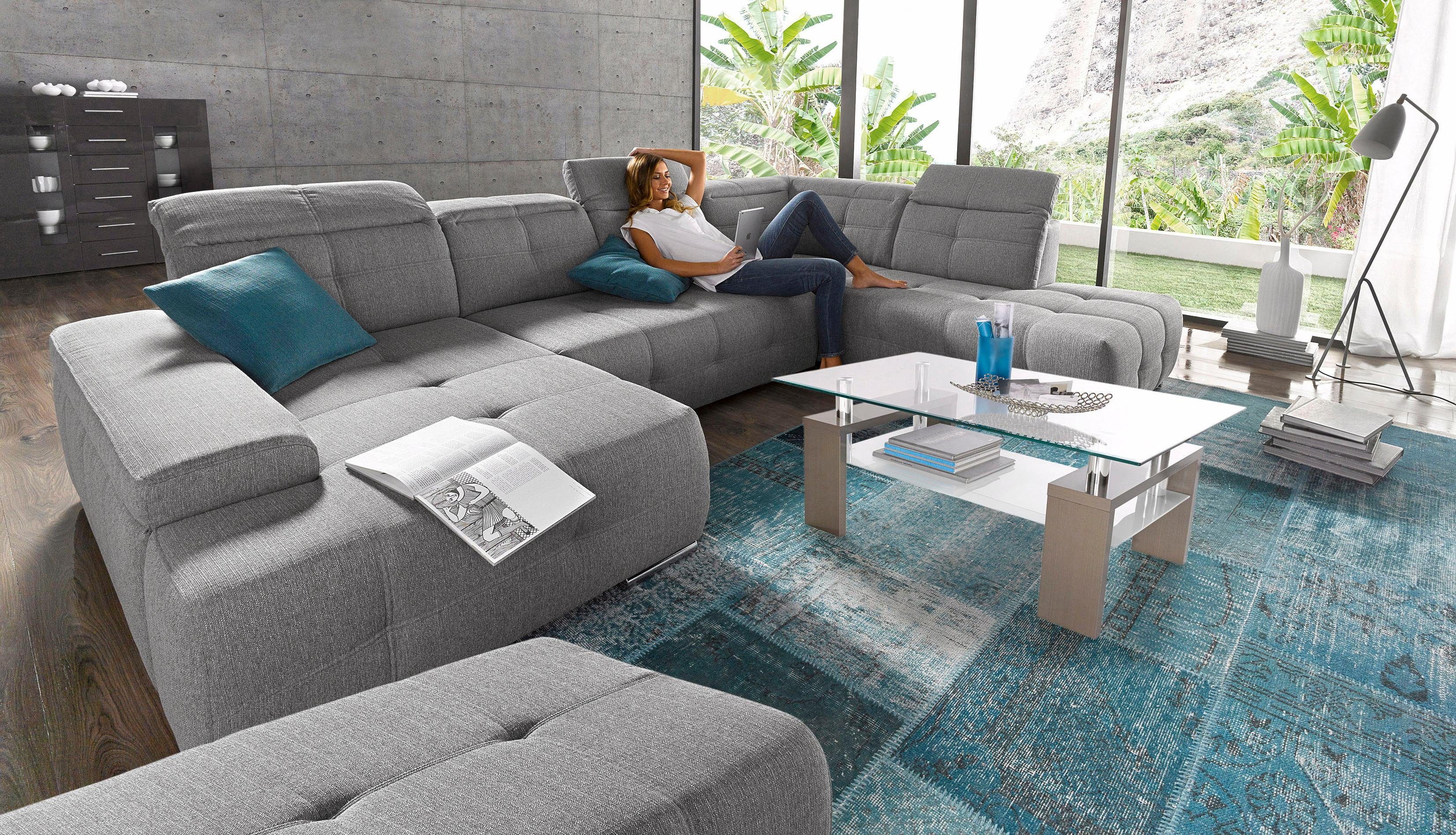 Eine dauerhaft elastische und komfortable Sitzfläche — das bekommst du bei dieser Wohnlandschaft »Mistral U-Form« von sit&more, die mit einer hochwertigen Wellenunterfederung ausgestattet ist. Wovon du auch profitierst, sind die passenden Zierkissen, die das Sofa noch komfortabler machen. Das Produkt ist manuell verstellbar. So kannst du mit ein paar Handgriffen deine bevorzugte Position einstellen. Von vorne betrachtet ist die Ottomane nach rechts ausgerichtet. Bei etwa 110 Kilogramm liegt die maximale Belastbarkeit pro Sitzplatz. Der strukturierte Bezug überzeugt durch seine pflegeleichte und hautsympathische Eigenschaft.