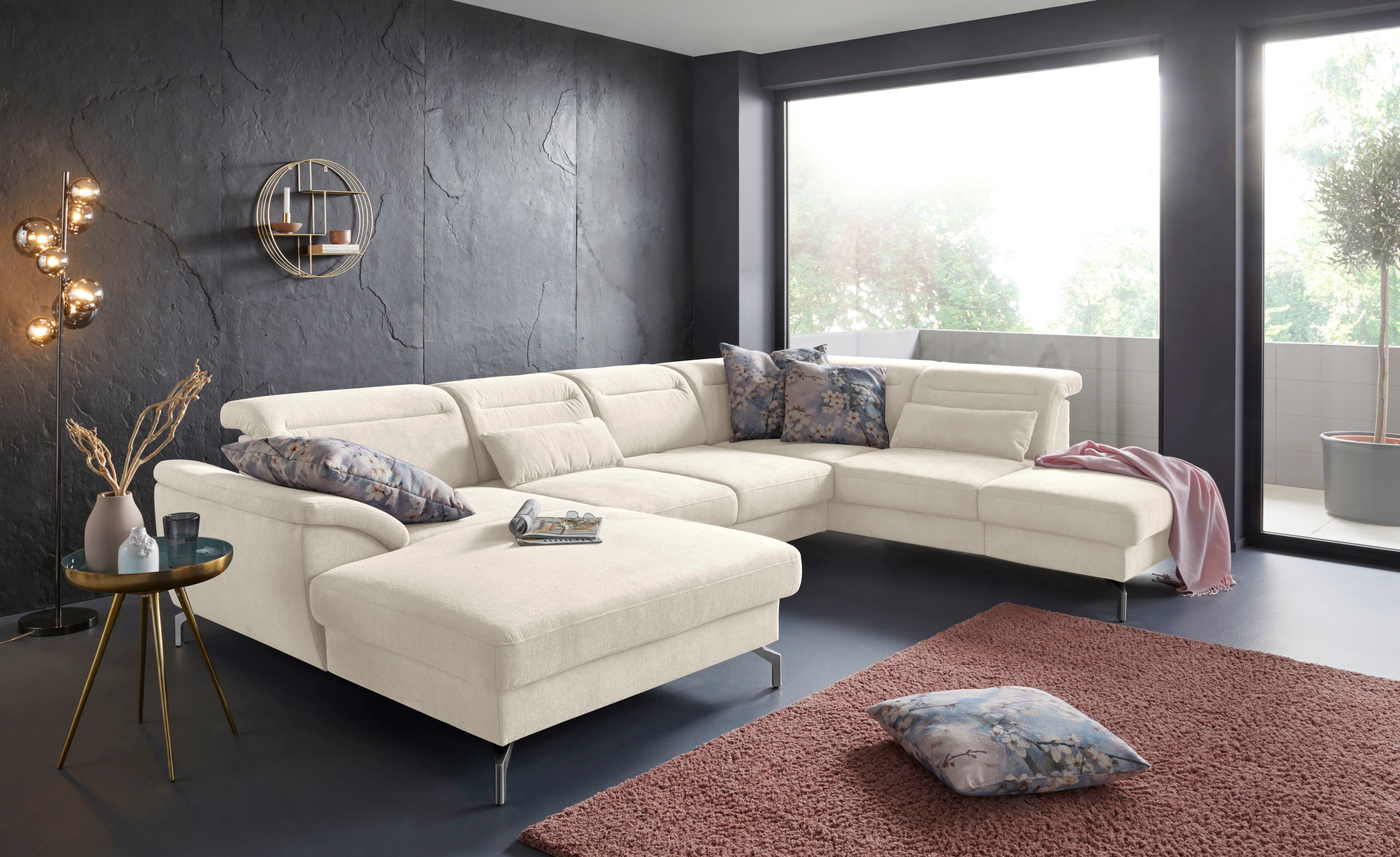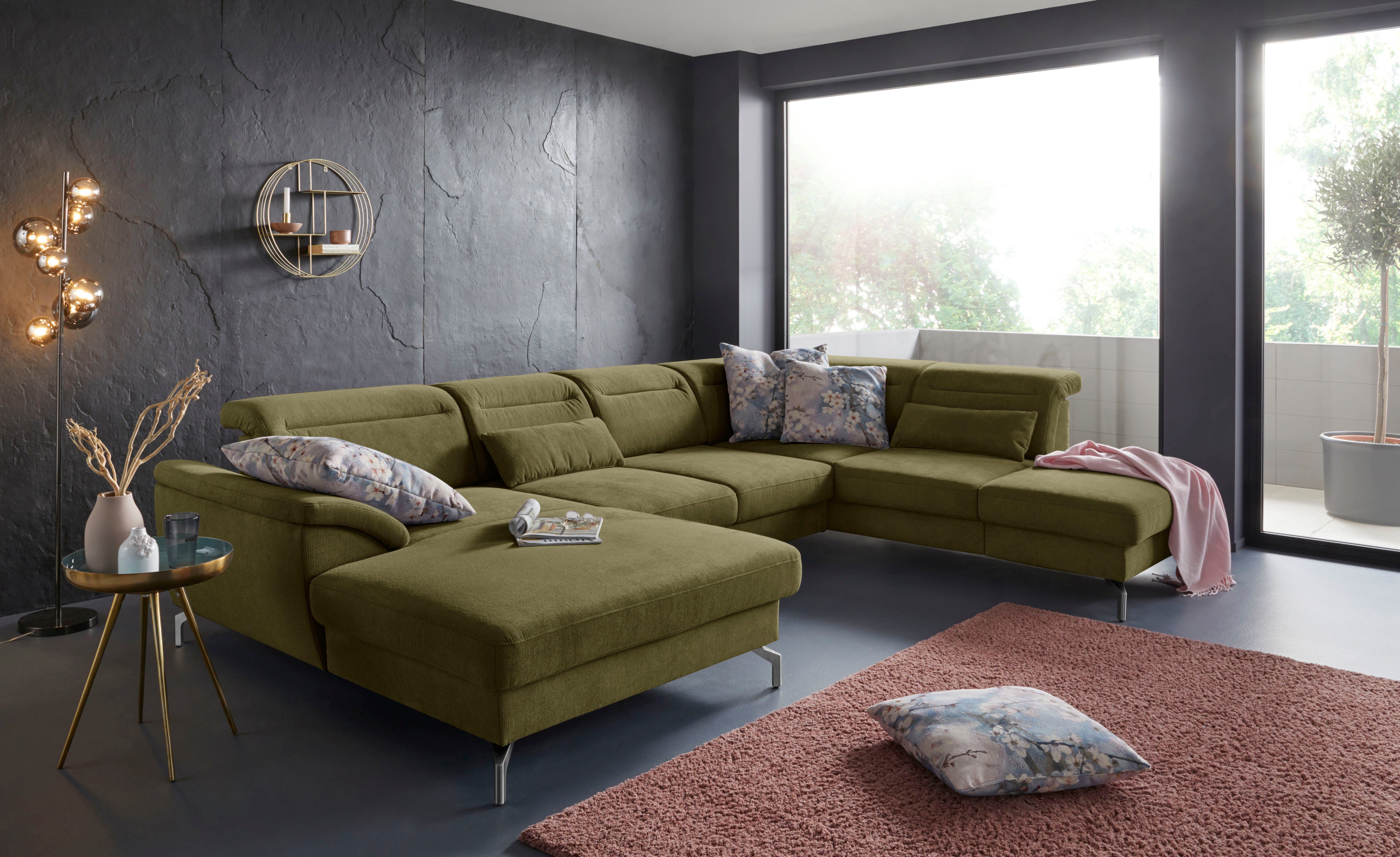 Diese Wohnlandschaft »Percy U-Form« von sit&more bietet dir dank der Wellenunterfederung hohen Sitzkomfort und Tragfähigkeit. Von vorne betrachtet ist die Recamiere nach links ausgerichtet. Die maximale Belastbarkeit pro Sitzplatz liegt bei einem Gewicht von 110 Kilogramm. Aus Metall gefertigt sind die satinierten Füße besonders widerstandsfähig und langlebig. Dieses Modell wurde von Hand gefertigt.