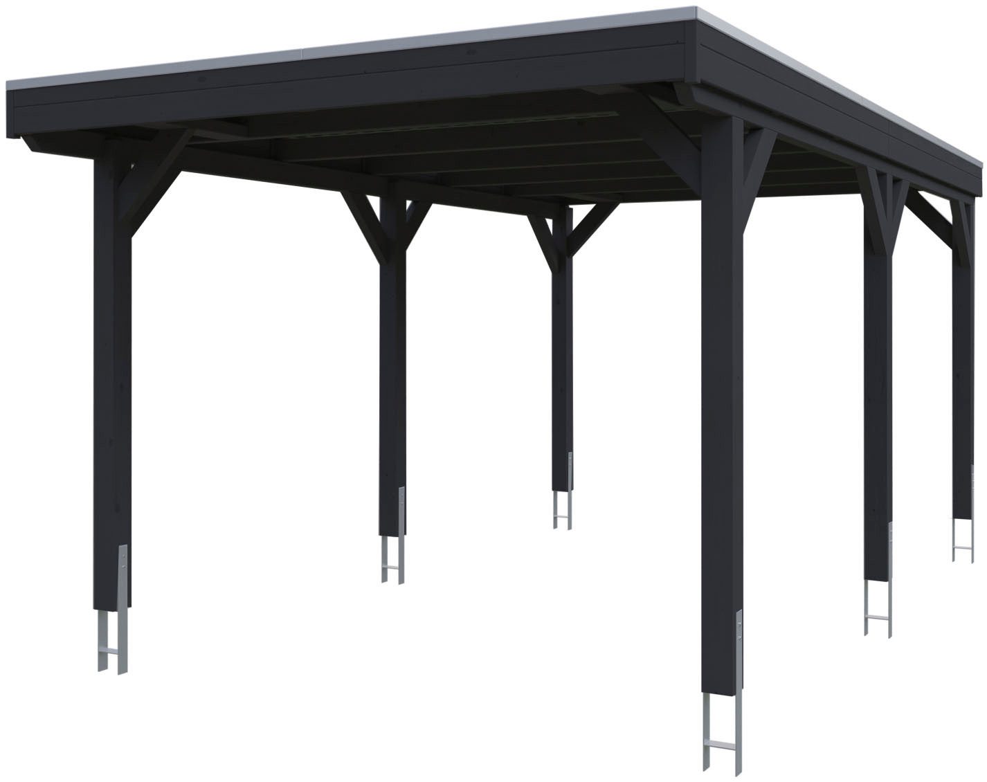 Lieferumfang | Aluminium-Dachplatten mit Trapezprofil, Profilholz-Blende mit Aluminium-Abschlusskante H-Pfostenanker zum Einbetonieren Montagematerial Pfosten 12 x 12 cm Vorgefertigter Bausatz aus Leimholz (BSH-Fichte), farblich behandelt |