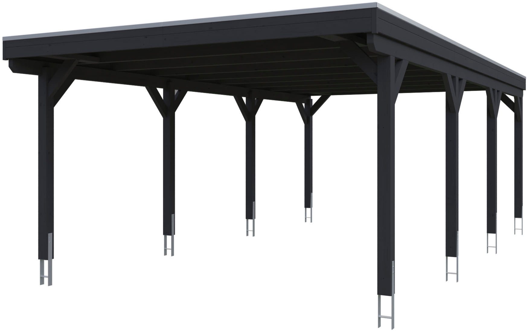 Lieferumfang | Aluminium-Dachplatten mit Trapezprofil, Profilholz-Blende mit Aluminium-Abschlusskante H-Pfostenanker zum Einbetonieren Montagematerial Pfosten 12 x 12 cm Vorgefertigter Bausatz aus Leimholz (BSH-Fichte), farblich behandelt |