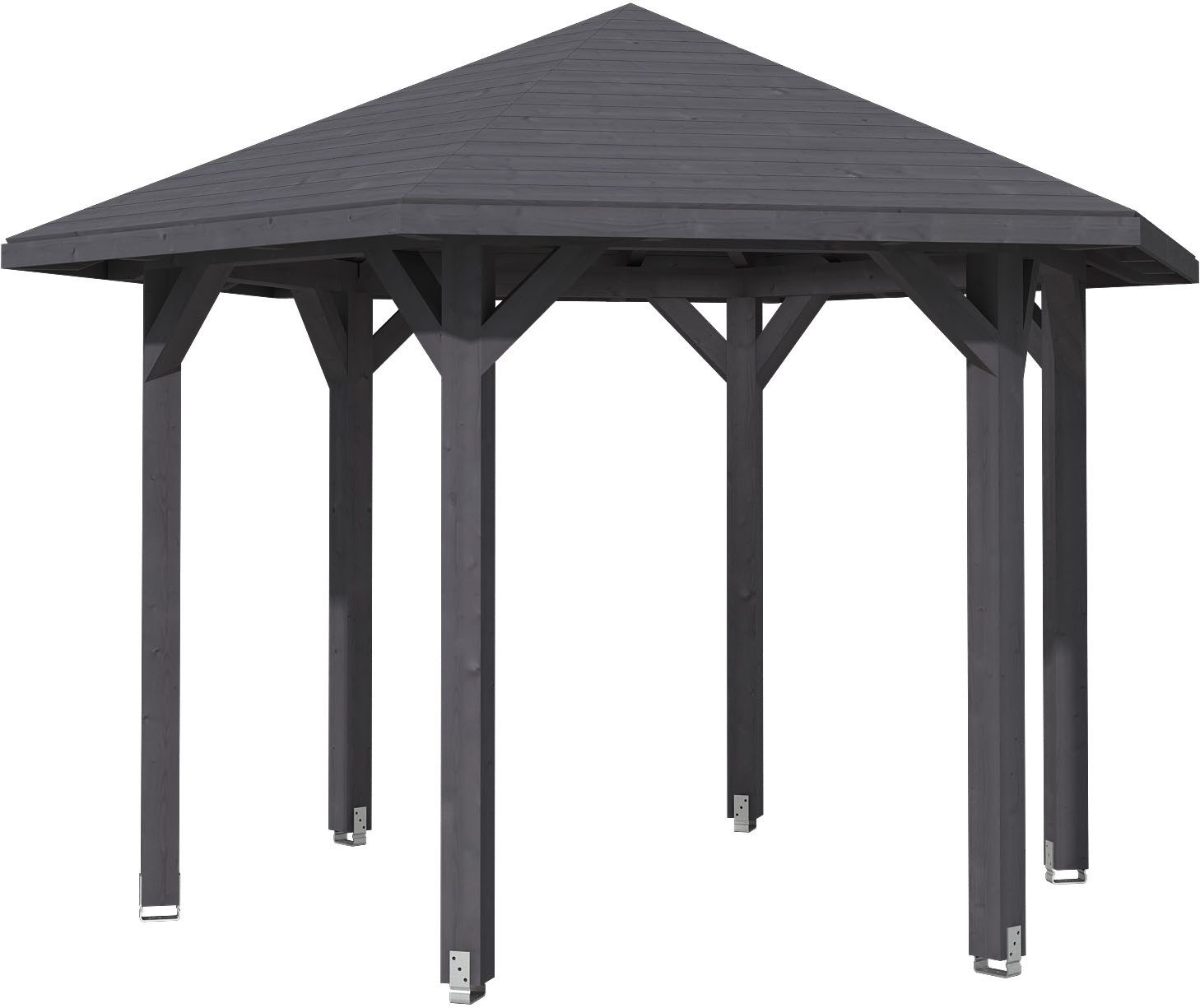 Aufschraubstützen aus verzinktem Flachstahl inklusive Dübel zum Befestigen auf das bauseitig erstellte Fundament sind im Bausatz enthalten. Sie gewähren eine sichere Verbindung zum Untergrund.