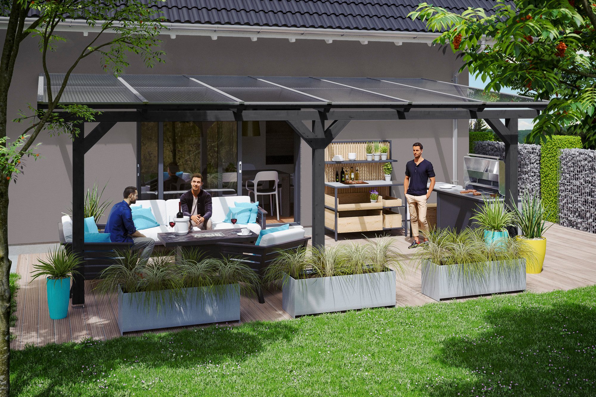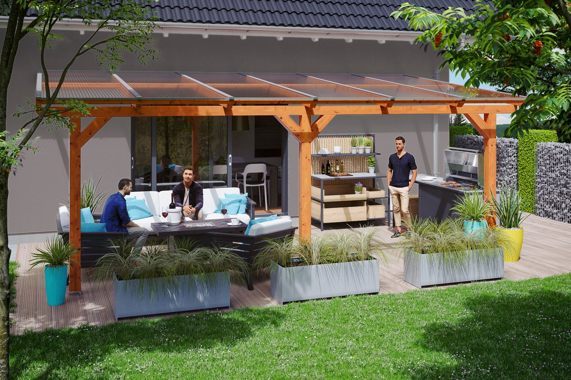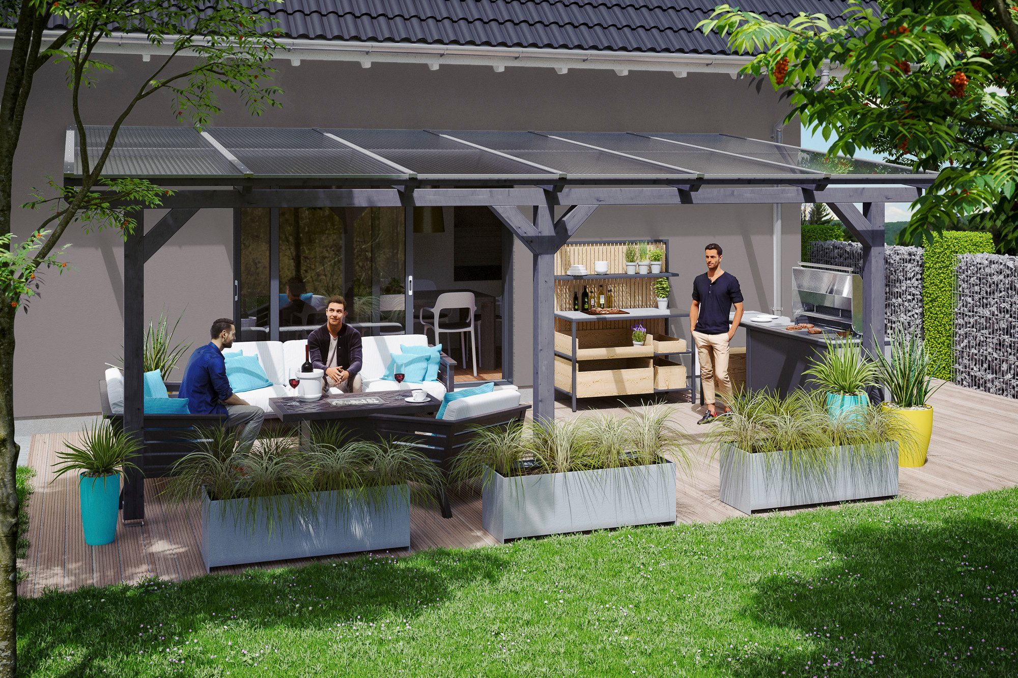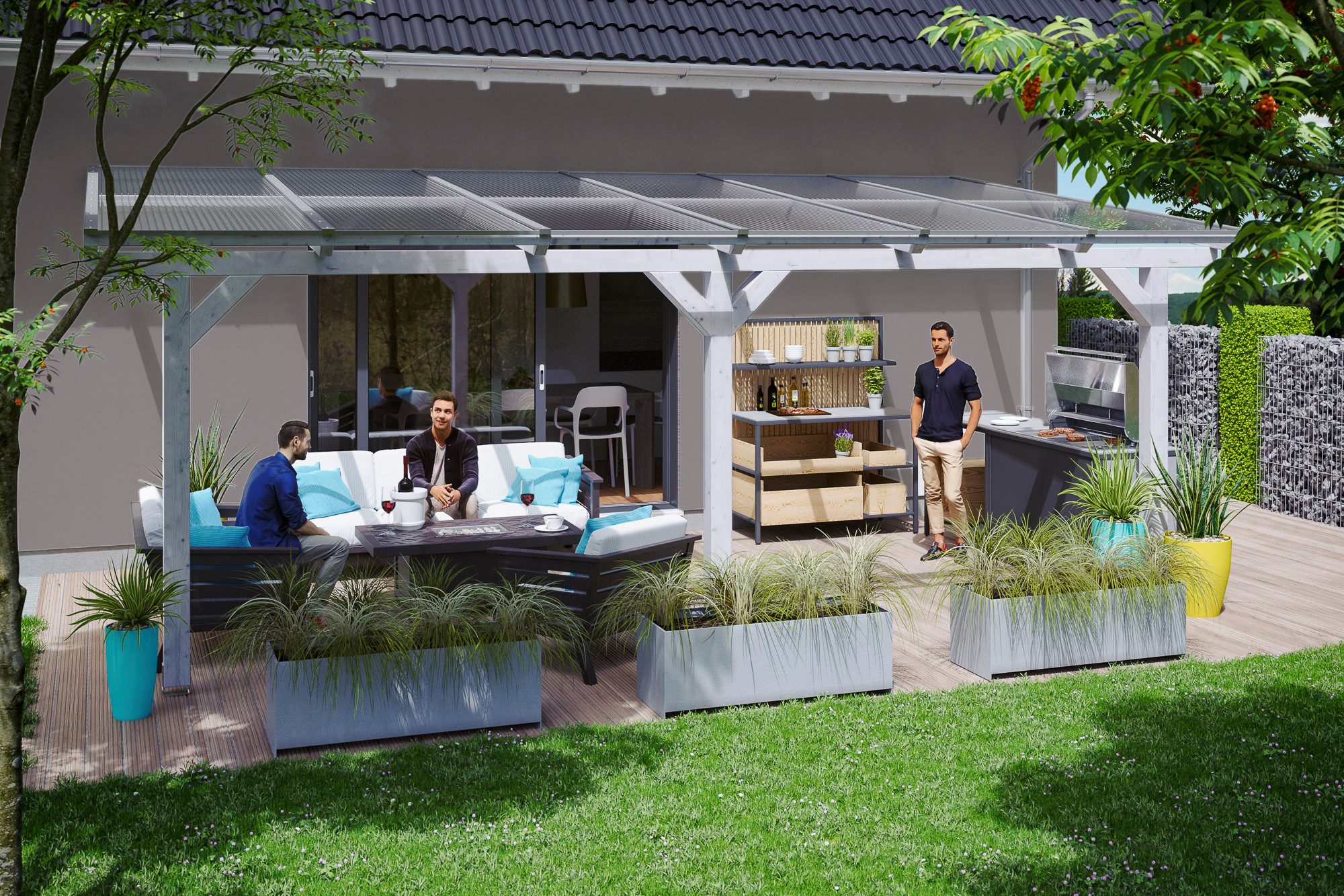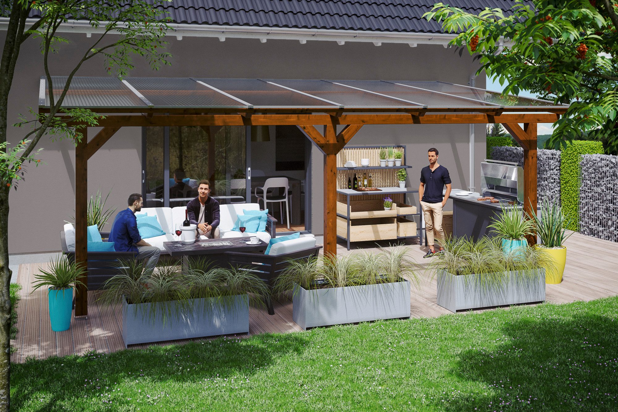 Die Dacheindeckung besteht aus stabilen, 10 mm dicken Polycarbonat Doppelstegplatten. Die Oberseite ist mit einer UV-reflektierenden Schicht versehen. Befestigt werden diese durch hochwertige Aluminium-Profile mit EPDM-Lippendichtungen.