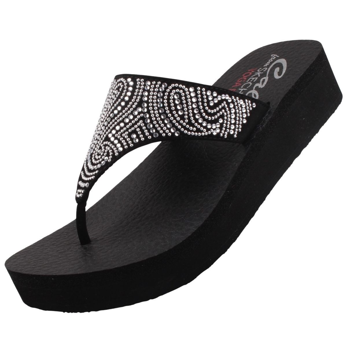 Diese Zehentrenner aus Synthetik mit Strass-Besatz sorgen für einen blendenden Auftritt. Das gepolsterte Yoga Foam Komfort-Fußbett wird Ihnen einen komfortablen Auftritt bescheren. 4 cm misst der Keilabsatz der flexiblen Traktionssohle.