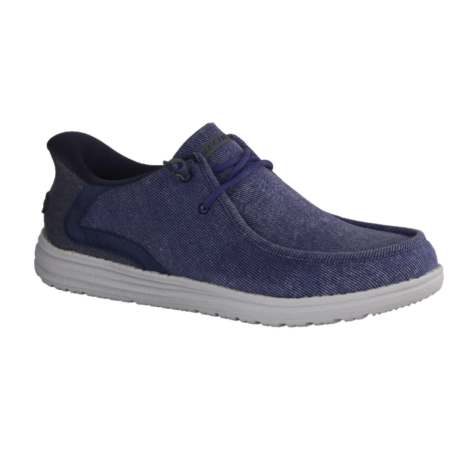 Der Herrenslipper Skechers Melson Coronado ist ein sportlicher und modischer Schuh in einem blauen Farbmix. Das Obermaterial besteht aus einem atmungsaktiven Textil, das für eine gute Luftzirkulation sorgt und die Füße trocken hält. Die elastischen Senkel sind modisches Accessoires, ermgölichen eine individuelle Anpassung an den Fuß und garantiert einen sicheren Halt. Das Innenfutter und die gepolsterte Innensohle bieten höchsten Tragekomfort und eine optimale Dämpfung bei jedem Schritt. Die flexible Laufsohle besteht aus synthetischem Gummi und bietet guten Grip und Stabilität auf verschiedenen Untergründen. Besonders praktisch ist die integrierte TPR-Sohleneinheit an der Ferse, die Stoßdämpfeffekte unterstützt und so eine extra Portion Komfort und Stabilität beim Gehen und Laufen bietet. Ahnlich wie ein Schuhlöffel wirkt die stark abgepolsterte Hacke, die ein schnelles Einsteigen -ohne sich zu Bücken- erlaubt. Zudem ist der Sliper vegan und lässt sich in der Maschine waschen. Zusammengefasst ist der Skechers Melson-Coronadoo ein komfortabler, stylischer und funktionaler Sommerschuh der ideal geeignet ist für Freizeit oder Alltag.
