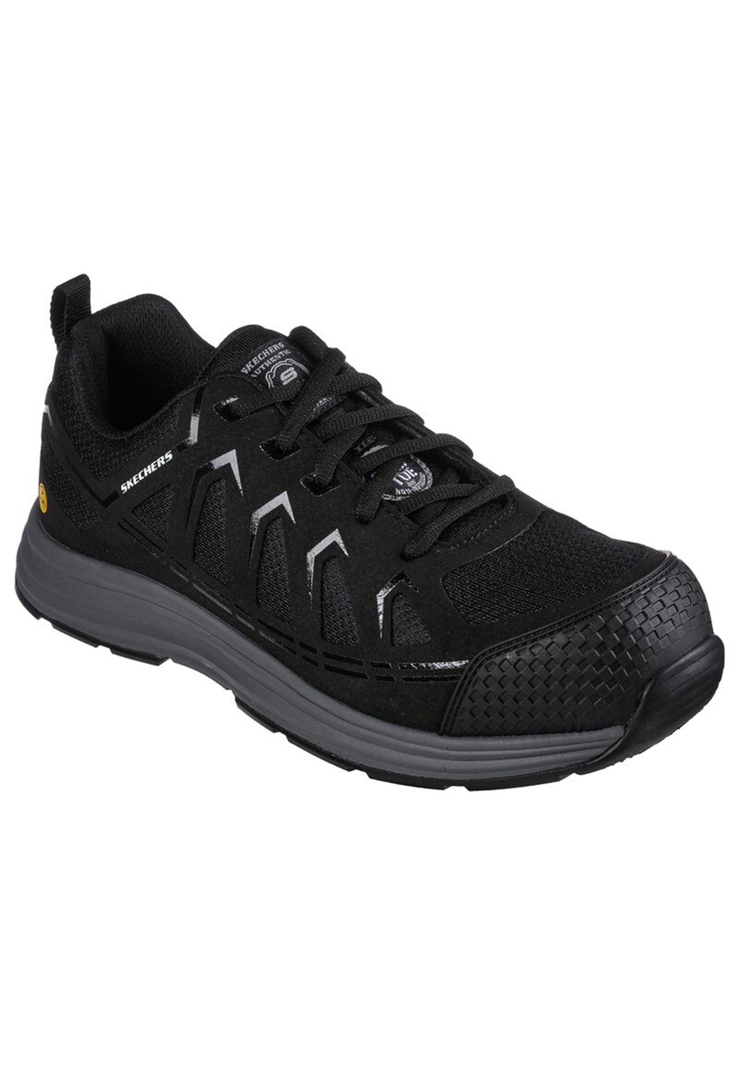 Erhöhen Sie den Schutz und den ganztägigen Komfort mit Skechers Work: Malad II. Glattes, strapazierfähiges Obermaterial aus Synthetik und Mesh auf einem sportlichen Schnürschuh mit Durchtrittshemmung und einer Zehenschutzkappe aus Verbundstoff. ESD fähig und Air-Cooled Memory Foam Einlegesohle