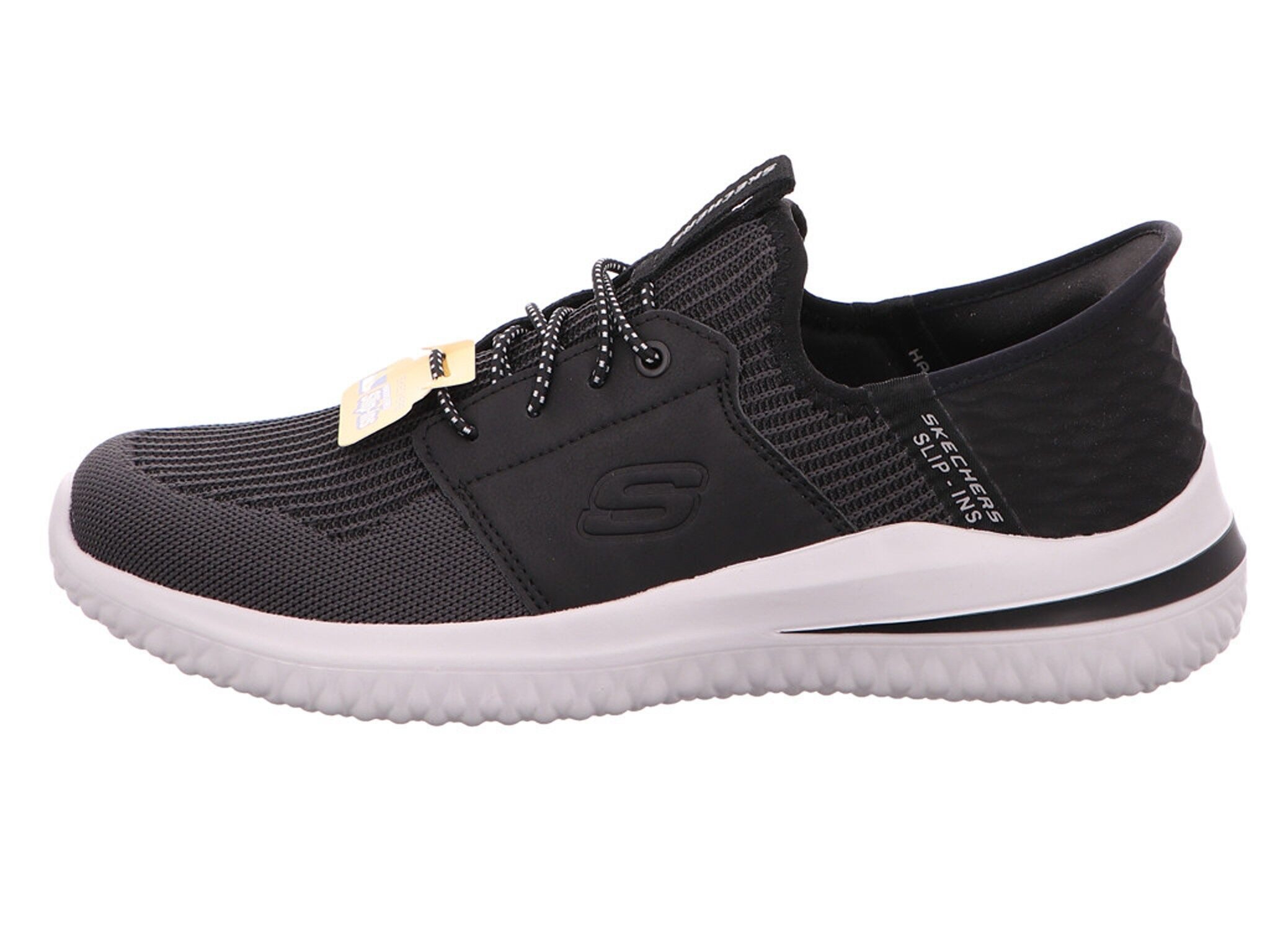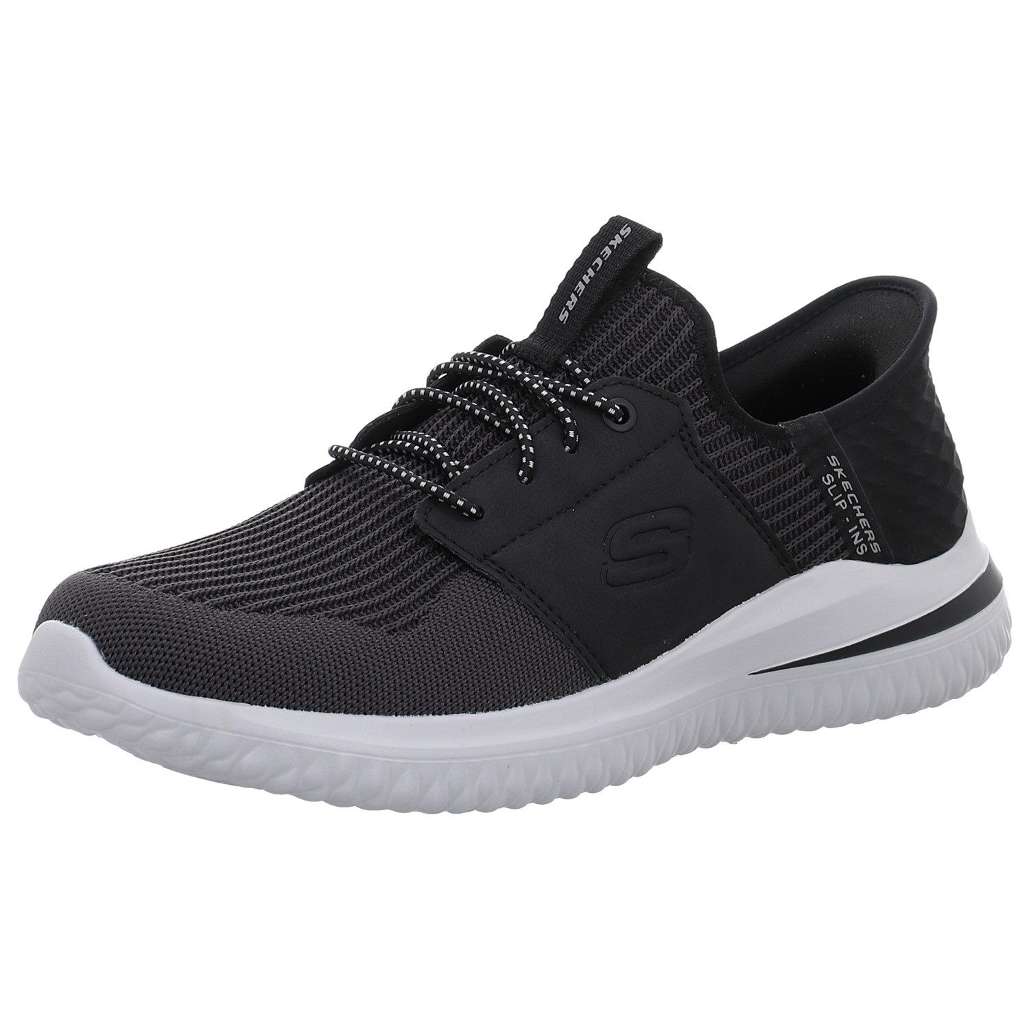 Der Skechers Herren Slip-On-Sneaker Delson 3.0 Lavell in blauem Textil-Synthetik-Mix vereint modernes Design mit höchstem Tragekomfort. Dank des praktischen Elastikbands in Schnüroptik lässt sich der Schuh mühelos an- und ausziehen und bietet gleichzeitig eine optimale Passform. Der gepolsterte Einstieg und die verstärkte Ferse sorgen für zusätzlichen Halt und Komfort. Das gepolsterte Memory Foam Fußbett passt sich individuell dem Fuß an und bietet ein angenehmes Tragegefühl über den ganzen Tag. Die flexible Laufsohle unterstützt natürliche Bewegungen und sorgt für eine gute Bodenhaftung. Durch das geringe Gewicht ist der Sneaker ideal für den Alltag geeignet und lässt sich vielseitig kombinieren – ob sportlich oder casual.