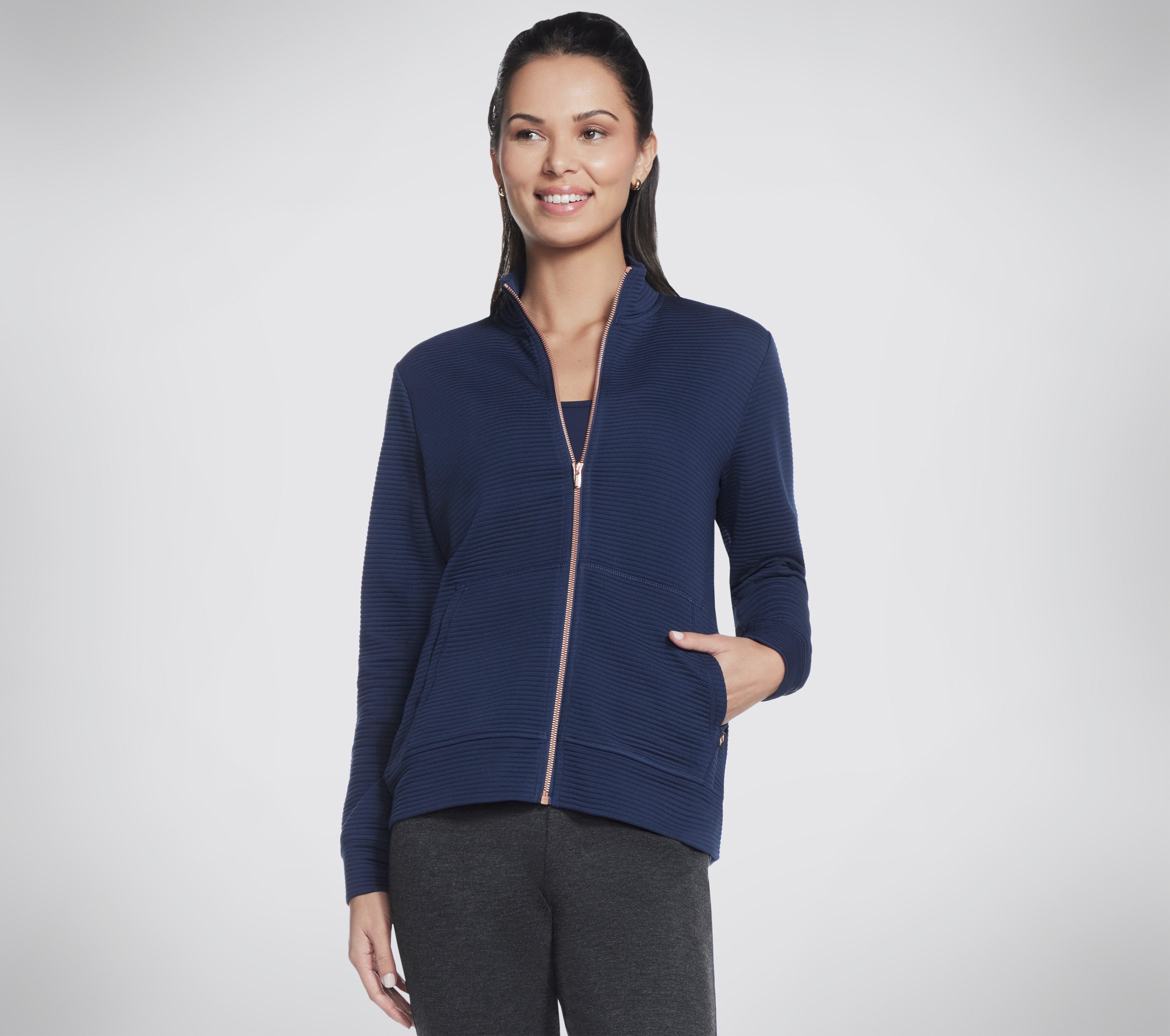 Mit der Trainingsjacke von Skechers kommen Sportlerinnen in Höchstform. Um flexibel auf das Wetter reagieren zu können, kann ein Funktionsshirt unter ihr getragen werden.