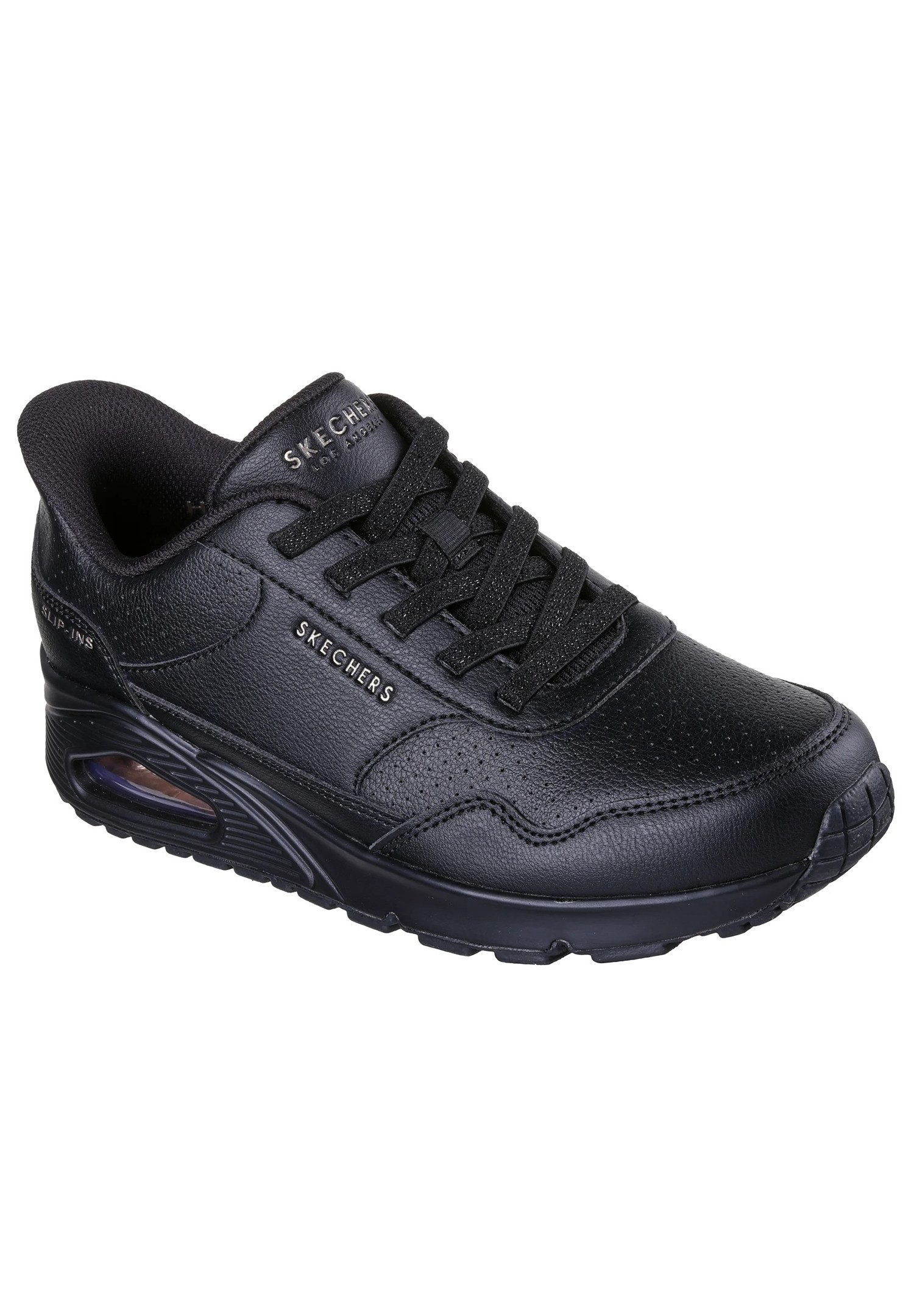 Die Skechers Slip-ins UNO – Banksia Luxe Damen-Sneakers vereinen Komfort, Style und innovative Technologie. Dank Slip-ins Design lassen sich die Schuhe mühelos anziehen – ganz ohne Bücken oder Hände. Das weiche Air-Cooled Memory Foam Fußbett sorgt für optimale Dämpfung und individuellen Tragekomfort. Die flexible Laufsohle mit Airbag-Dämpfung bietet Stabilität und ein angenehmes Laufgefühl. In klassischem Schwarz sind die UNO Banksia Luxe die perfekte Kombination aus sportlich und elegant – ideal für Alltag, Freizeit oder Reisen.
