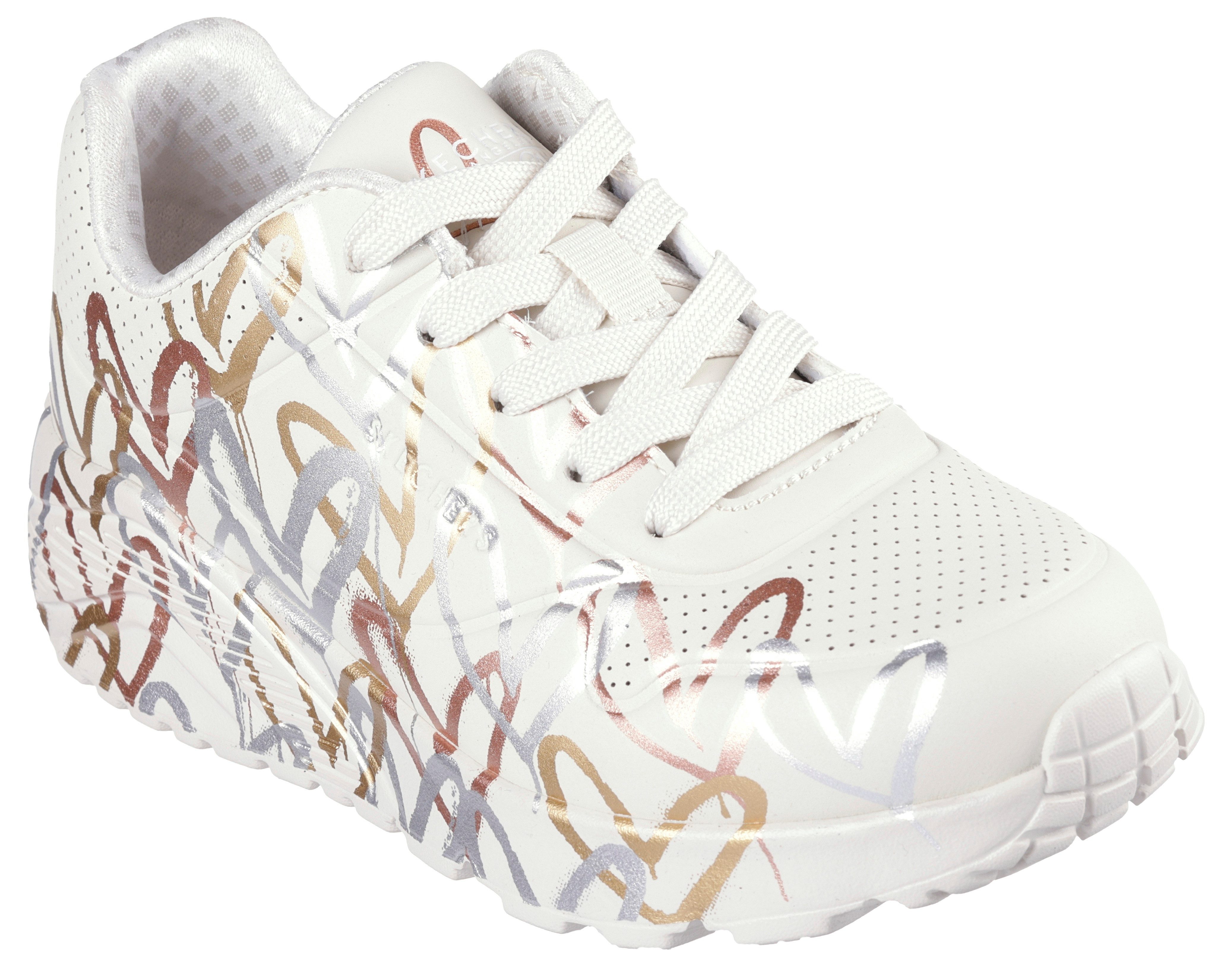 Die Skechers Street x JGoldcrown UNO Lite – Metallic Love Mädchen-Sneakers kombinieren auffälligen Style mit bequemem Tragekomfort. Das glänzende Obermaterial in Hot Pink Multi mit buntem Herz-Print stammt aus der exklusiven Kollaboration mit Künstler JGoldcrown und zieht alle Blicke auf sich. Dank Air-Cooled Memory Foam Fußbett laufen Kinder den ganzen Tag angenehm weich. Die leichte Zwischensohle sorgt für federnde Schritte, während die flexible Gummisohle sicheren Halt auf jedem Untergrund bietet.