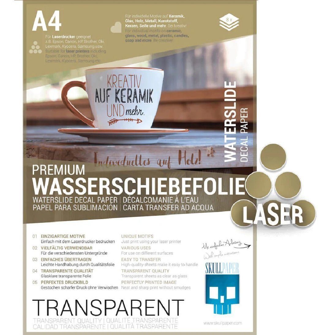 Du kannst mit der SKULLPAPER Wasserschiebefolie deine Decals selbst herstellen - kostengünstig und schnell! Die meisten Hersteller produzieren sie im Siebdruckverfahren lediglich in hohen Stückzahlen, so dass du nun die Möglichkeit hast kleine Einheiten und nach deinen Wünschen mit deinem Laserdrucker zu Hause (oder im Copyshop) selbst zu erstellen. Besonders eignet sich das Verfahren für Miniaturarbeiten, Modellbau aber auch für Dekore an Fahrrädern oder zum dekorativen Gestalten von Tassen, Gläser, Kerzen, Kunststoffbehälter usw. Deinen Ideen sind keine Grenzen gesetzt! Применитьe kreative Geschenke, gestalte ein individuelles Dekor für dein Fahrrad oder nutze die Folie im Miniaturbereich. Für deine kreativen DIY-Ideen verfügbar: Premium Aufkleber-Folie Transferfolie Transparent Tintenstrahldrucker Premium Aufkleber-Folie Transferfolie Transparent Laserdrucker Premium Wasserschiebefolie Transferfolie Transparent Tintenstrahldrucker Premium Wasserschiebefolie Transferfolie Transparent Laserdrucker Premium Wasserschiebefolie Transferfolie Weiss Laserdrucker Premium Textiltransferfolie für helle Stoffe Laserdrucker Premium Textiltransferfolie für dunkle Stoffe Laserdrucker Premium Textiltransferfolie für dunkle Stoffe Tintenstrahldrucker Premium Magnetfolie für Tintenstrahldrucker Premium Tattoo Transferfolie Laserdrucker Premium Tattoo Transferfolie Tintenstrahldrucker