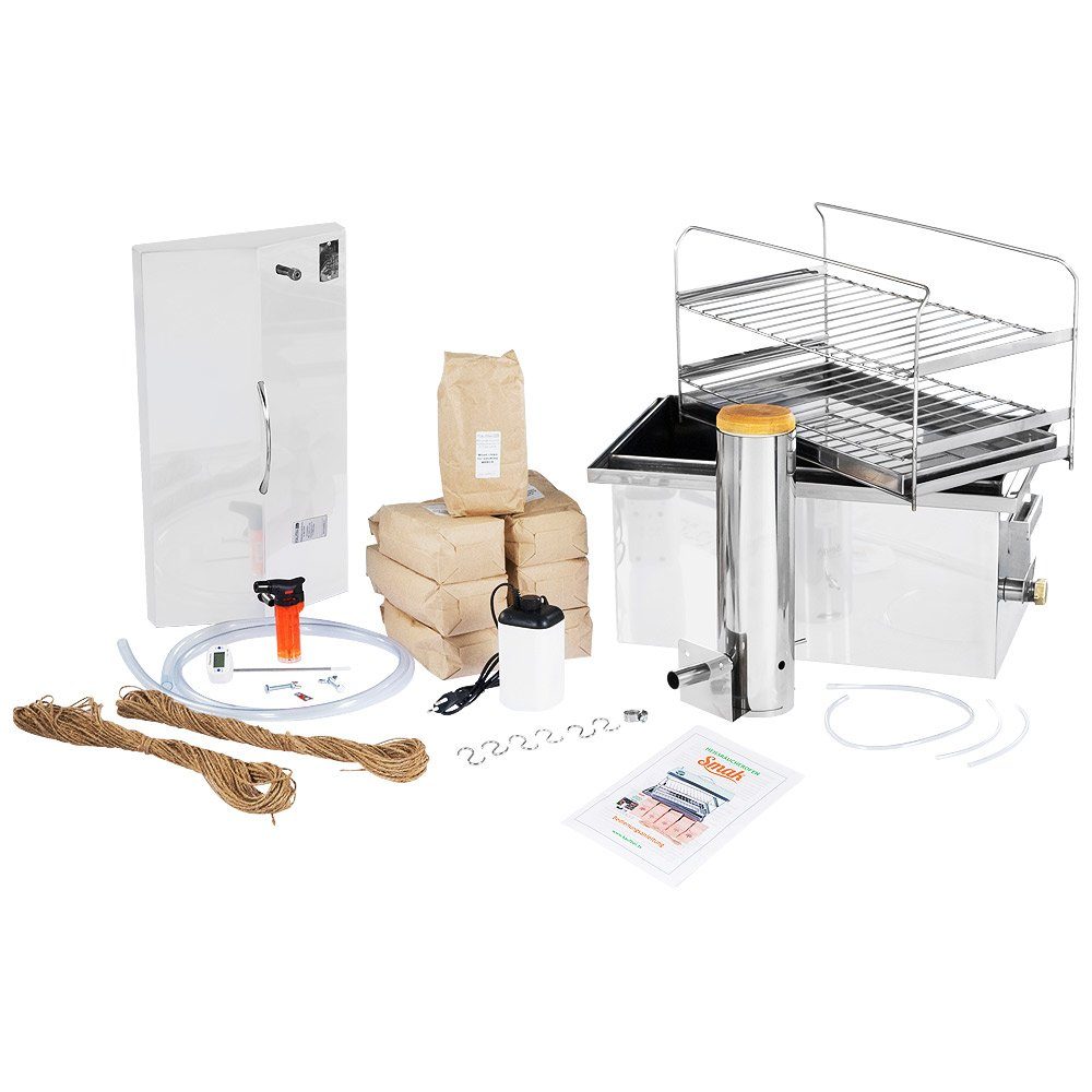 Ausstattung | Edelstahlzylinder abnehmbares Untergestell Edelstahlrauch- und Luftableiter (Kaltrauchgenerator) Deckel aus Erlenholz Doppelkammerluftkompressor Silikonschlauch Holzspäne (versch. Sorten) Befestigungsschrauben Räucherschnur Tragetasche Sturmfeuerzeug Rezeptbuch |