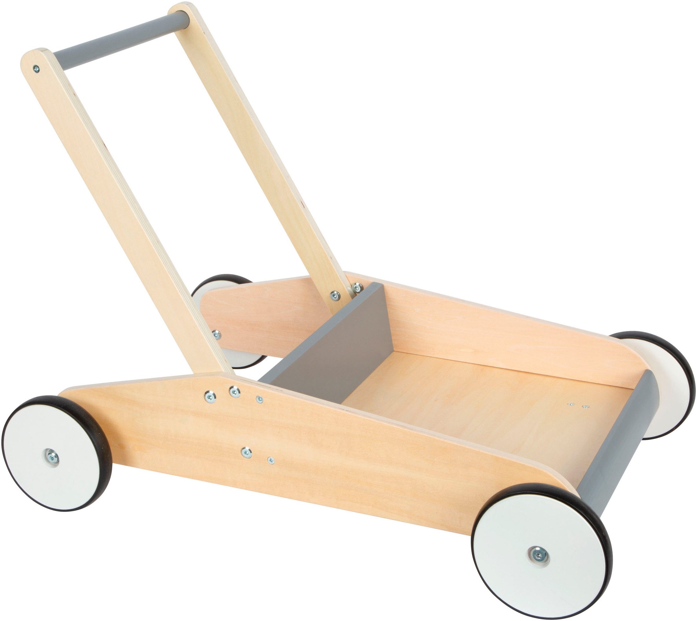 Perfekt zum Spielen, Laufen und Lernen! Dieser Lauflernwagen ist nicht nur ein Spielzeug, sondern der perfekte Begleiter für die ersten Schritte kleiner Abenteurer. Mit seiner Kombination aus naturbelassenem Holz und der kräftigen Trendfarbe Schiefergrau ist er zudem ein echter Hingucker in jedem Kinderzimmer. Aus hochwertigem Holz gefertigt, ist er besonders robust und praktisch, denn die große Ladefläche bietet viel Platz für Spielsachen, die bei den ersten Gehversuchen unbedingt mitmüssen. Dank des integrierten Bremssystems ist der Lauflernwagen jederzeit sicher in der Handhabung und passt sich der Laufentwicklung und dem Können an. Abgerundete Kanten sorgen für zusätzliche Sicherheit. Mit der zweifachen Höhenverstellbarkeit der Griffhöhe ist der Lauflernwagen zudem für kleine als auch größere Kinder optimal geeignet und kann mitwachsen. Gummierte Räder sorgen für leises und sicheres Rollen auf verschiedenen Untergründen. Schiebe- und Laufwagen sind ideal für spielerisches Lernen, denn ein Gehwagen ist nicht nur eine perfekte Hilfestellung bei den ersten Schritten, sondern zugleich ein Trainingsgerät für den Gleichgewichtssinn. Lauflernwagen ermöglichen es Kindern, ihre Umgebung spielerisch zu erkunden und ihren Bewegungsradius stückweise zu erweitern.