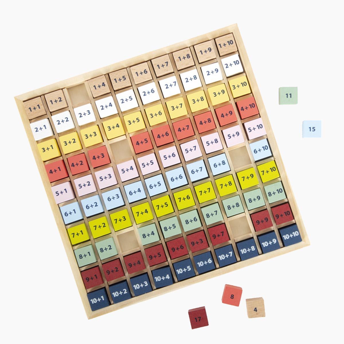 Das Rechenbrett besteht aus 100 kleinen Würfeln, die verschiedene Additionsaufgaben im Zahlenraum bis 20 zeigen. Die Kinder können die Ergebnisse durch Drehen kontrollieren und so selbstständig lernen. Dieses aktive Lernen stärkt das Verständnis für Mengen, Zahlenfolgen und mathematische Zusammenhänge.