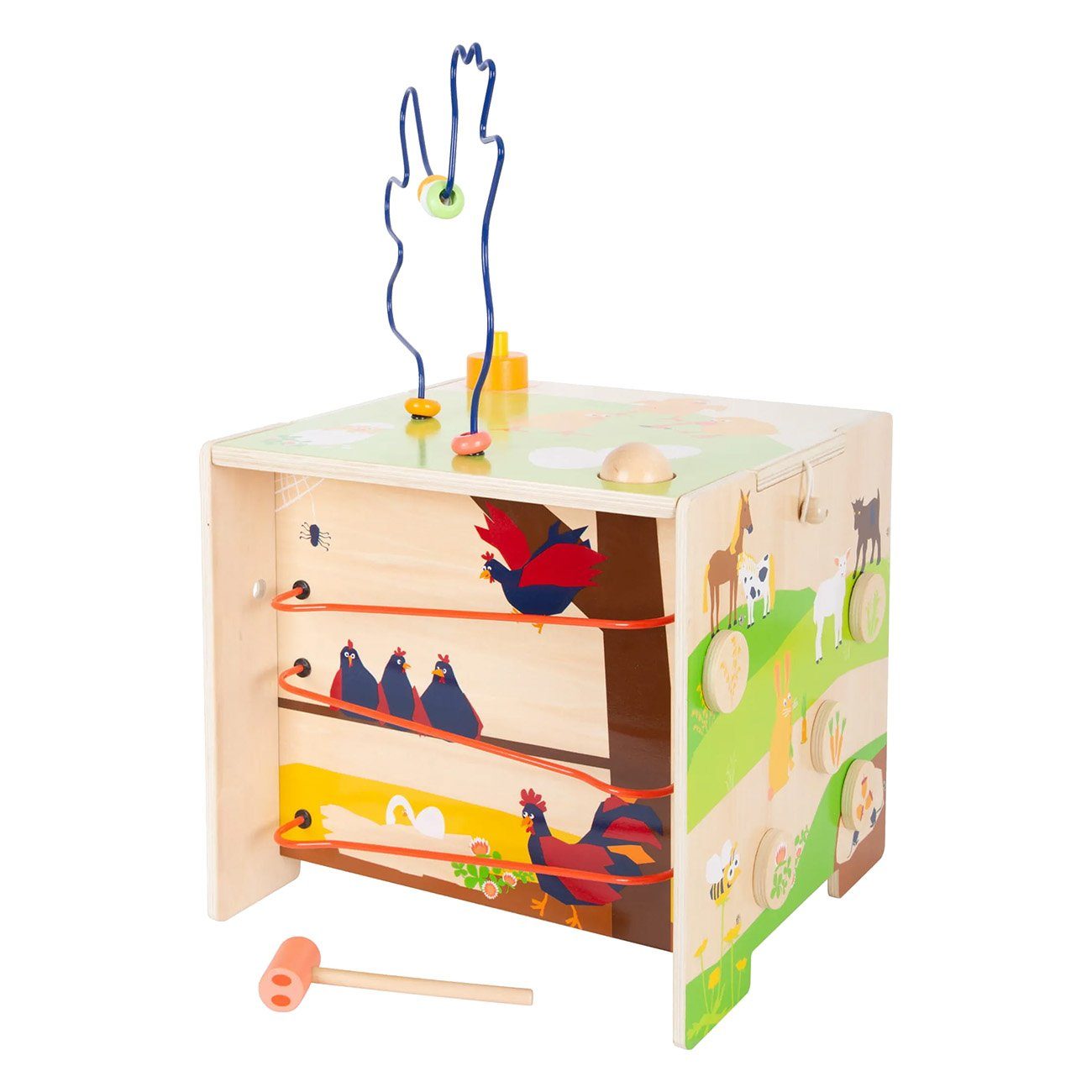 Auf dem Land ist was los! Mit großer Motorikschleife in Hühner-Form, Formsteckspiel, Schiebelabyrinth, Farbsortierspiel sowie Klopfkugelbahn und Hupe ist dieser Motorikwürfel ein Multitalent auf fünf aktiv bespielbaren Flächen. Die liebevoll gestaltete Kulisse mit Bauernhoftieren animiert zur Interaktion und zum Geschichtenerzählen. Wird der mit einem Verschluss gesicherte Deckel umgedreht im Würfel verstaut, entsteht im Nu ein stabiler Kinderhocker!> Für multifunktionalen Lernspaß durch ein Steckspiel, ein Farbsortierspiel, das die Farberkennung schult und ein Schiebelabyrinth> Der mit einem Verschluss gesicherte Deckel kann umgedreht im Würfel verstaut werden und somit auch als Kinderhocker genutzt werden> An einer seitlichen Klopfkugelbahn werden Kugeln in Form von Eiern ins Hühnernest befördert> Eine Quietischhupe setzt akustische Reize und schult die auditiven Fähigkeiten> Der Motoriktrainer vermittelt grundlegendes Wissen über Tiere auf dem Bauernhof und animiert zum interaktiven Geschichten erzählen