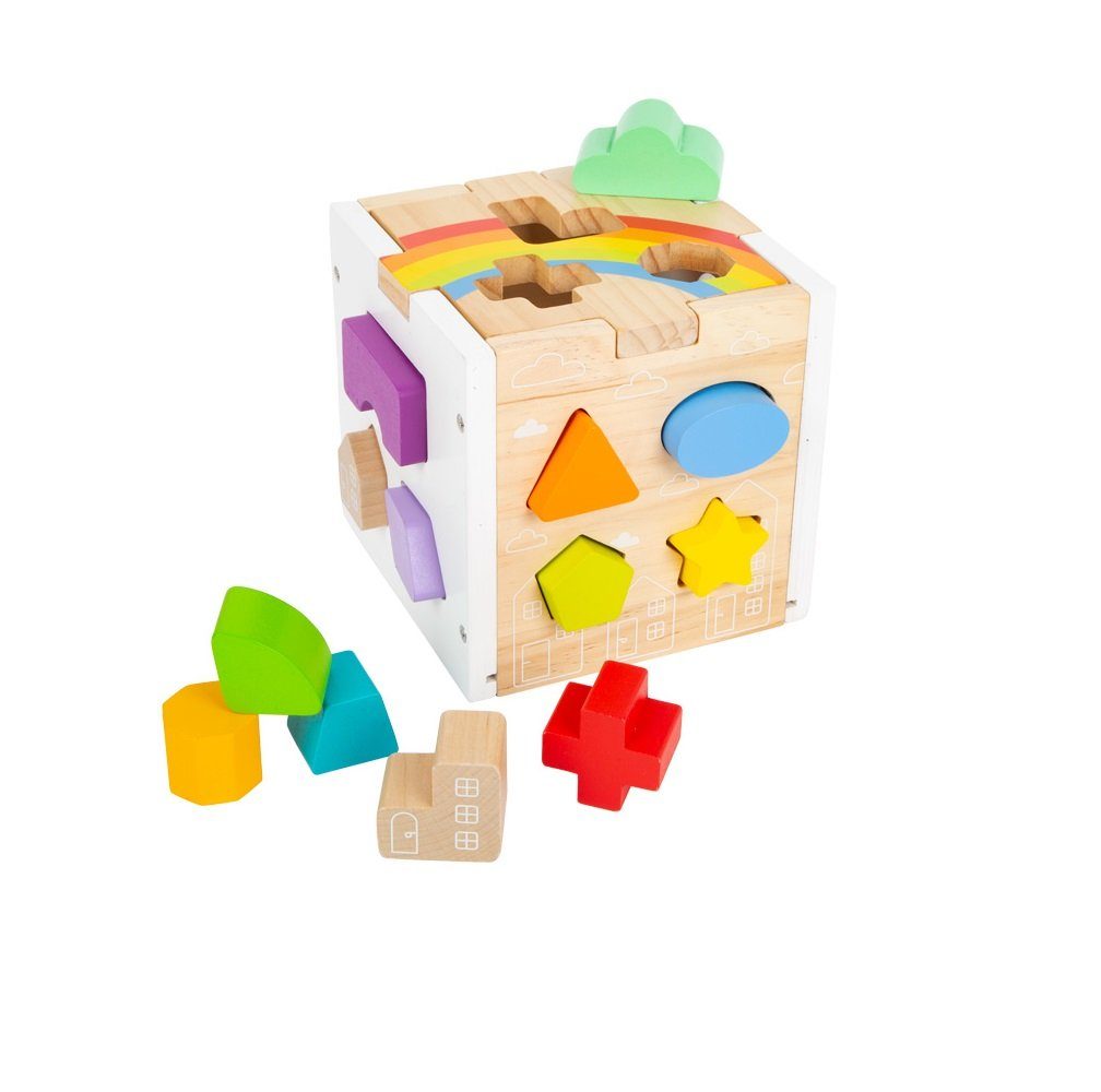 SFC Sortier Box Regenbogen Spielbox 1+ Dieser moderne Steckwürfel aus robustem Holz kombiniert schlichtes Weiß, leuchtende Regenbogenfarben und einen hohen sichtbaren Vollholzanteil. 13 unterschiedlich geformte, farbige und zum Teil naturbelassene Steckelemente trainieren Farb- und Formerkennung sowie motorische Fähigkeiten. Neben klassischen geometrischen Formen gibt es auch Wolken, Sterne und Häuser zum Stecken! Dezente Aufdrucke auf den Naturholzflächen ergänzen sich stimmig und der abnehmbare Holzdeckel lässt sich formschlüssig aufsetzen. Welches Steckelement passt in welche Öffnung? Eine langanhaltende Beschäftigung mit Lern- und Spaßeffekt für die Jüngsten. Durch das Öffnen des Deckels lassen sich alle Steckbausteine kinderleicht wieder herausnehmen. 1 Würfel, 13 Steckelemente ab 12 Monaten aus Holz Maße: 15x15 cm Achtung! Entfernen Sie das Verpackungsmaterial bevor das Kind das Spielzeug erhält.