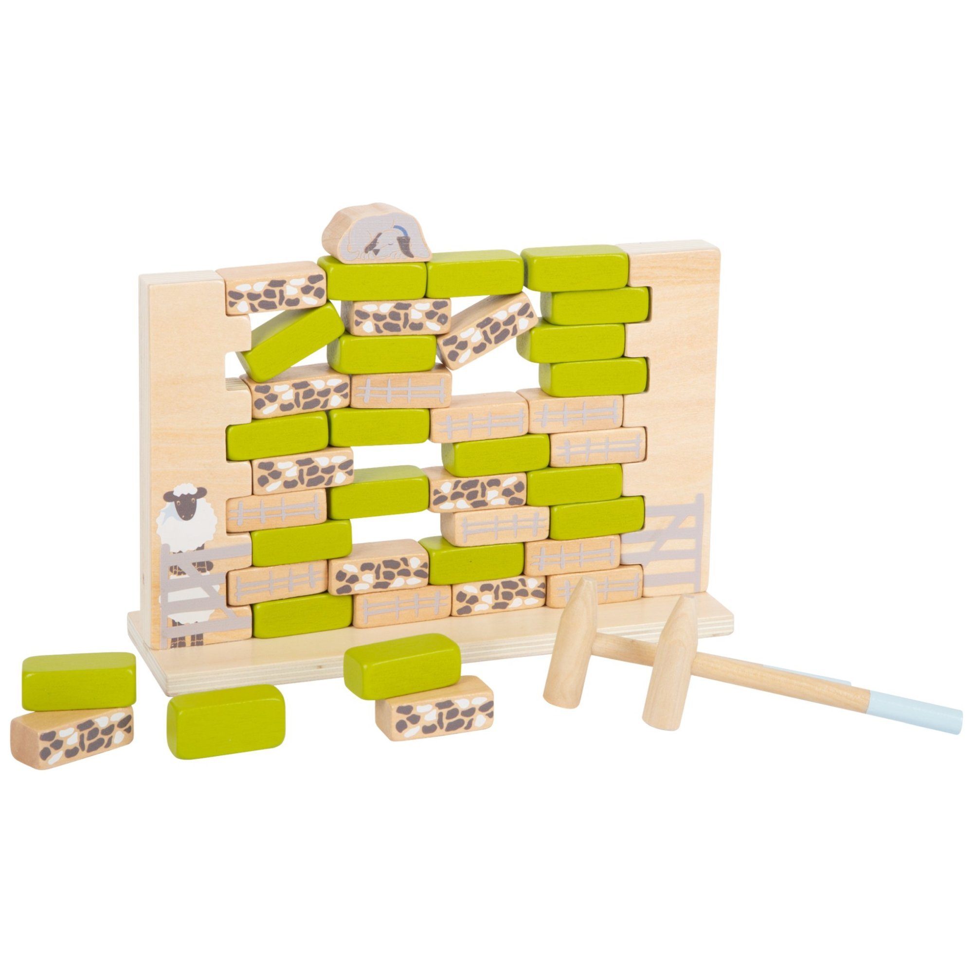 Wackelspaß am Weidezaun! Das Schaf "Schippi" und seine Freunde wollen das Land auf der anderen Seite des Zaunes unsicher machen und so gilt es, mithilfe der zwei handlichen Holzhammer ein Loch in den "Zaun" der Weide zu klopfen. Damit die Wackelmauer nicht zusammenbricht, sind Konzentration und Geschick gefragt. Aber Achtung: wenn die Mauer einstürzt, wacht der Hütehund oben auf der Mauer auf und das Spiel ist verloren! Mit hochwertigem Spielkarton zur dauerhaften Aufbewahrung. Das Gesellschaftsspiel kann alleine oder in der Gruppe gespielt werden und überzeugt durch ein besonders kindgerechtes Design und durch einen hohen sichtbaren Naturholzanteil. Dabei animiert die Wackelmauer immer wieder zu neuen Runden und verspricht langen Spielspaß. Wer entfernt den ersten Stein aus der Mauer?