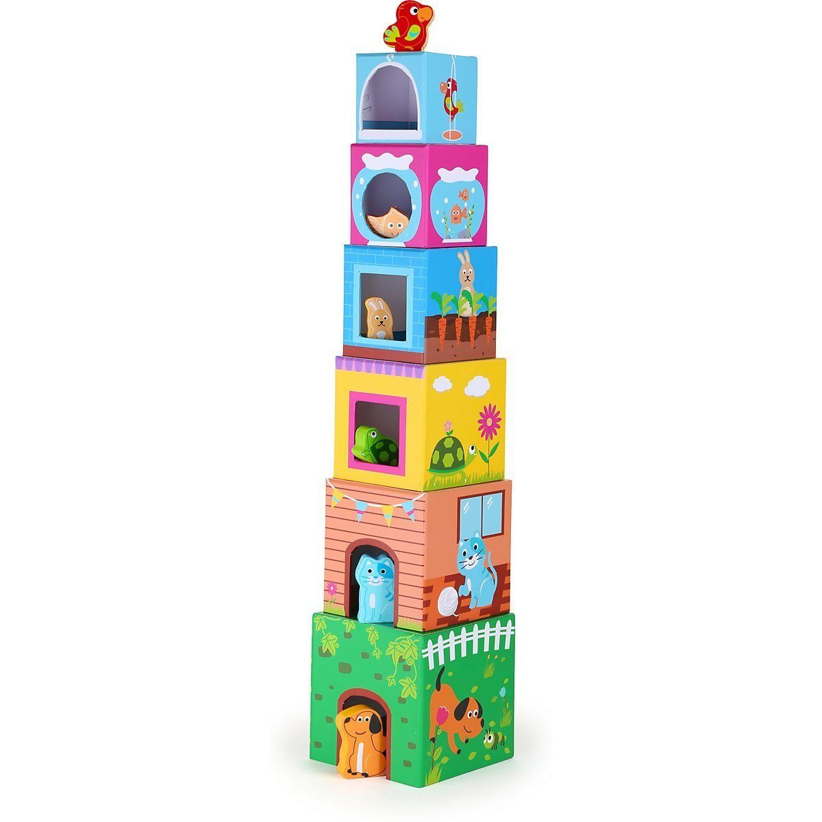 Stapeln, sortieren und Spaß haben: Die aus Pappe gefertigten Würfel von Small Foot und sechs niedliche Holztiere bieten dem Nachwuchs ein spielerisches Motoriktraining.