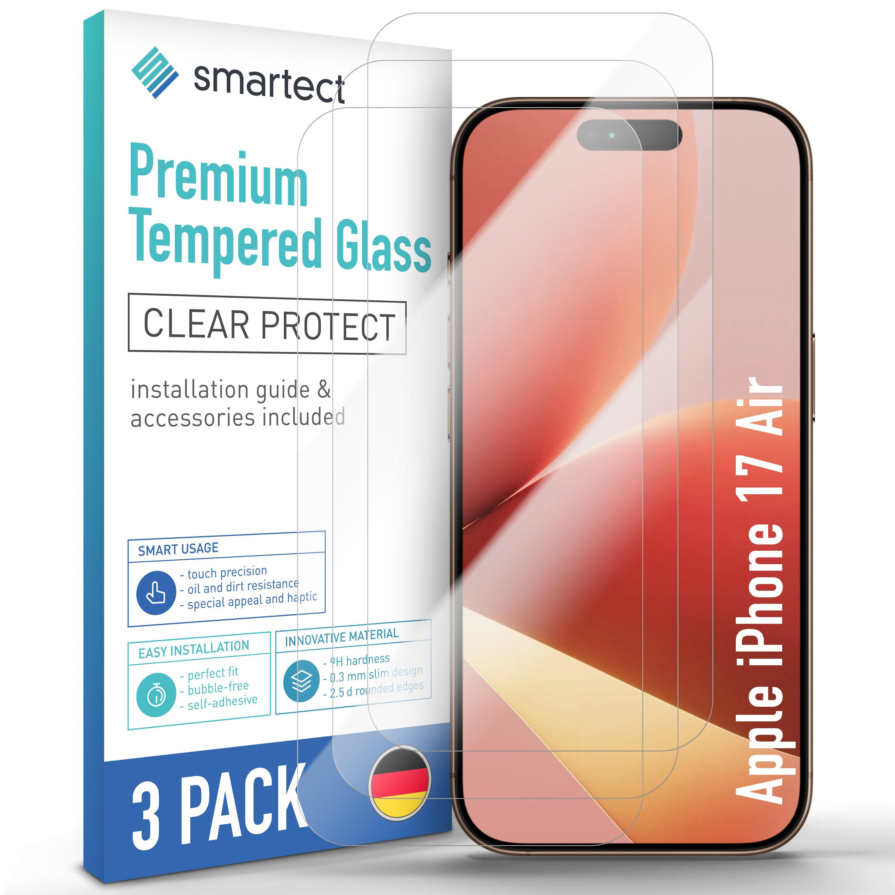 Maximale Passgenauigkeit: Die Glasfolie ist zu 100% kompatibel mit dem Produkt Apple iPhone 17 Air. Bitte beachten Sie, dass bei einem gerundeten Display lediglich die horizontale Fläche vom Handyschutzglas bedeckt wird
