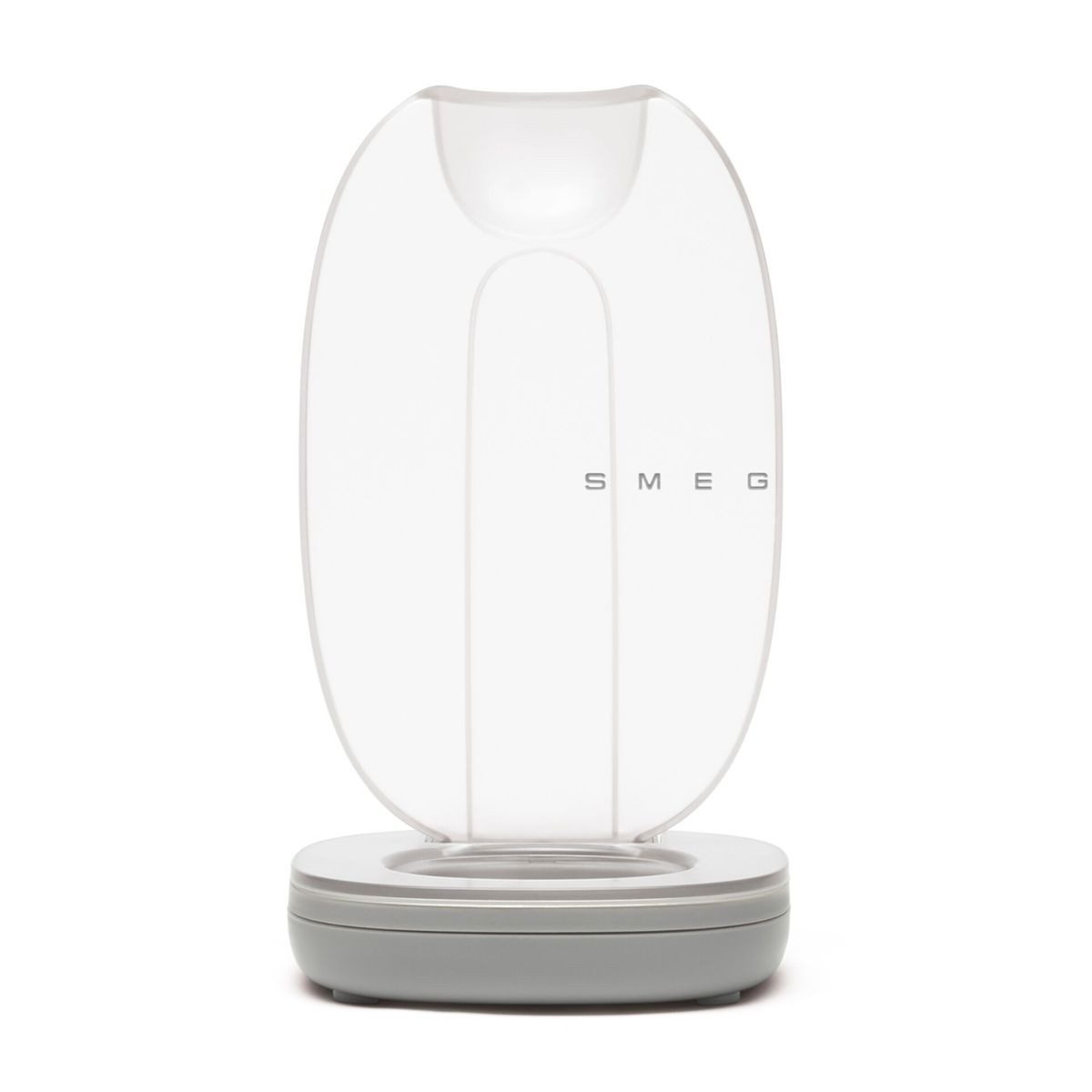 Der Gerätehalter von Smeg verfügt über einen abnehmbaren Sockel zur einfachen Reinigung und ist spülmaschinengeeignet. Das polierte Chrom-Logo und die mattgraue Kunststoffbasis mit rutschfesten Füßen verleihen ihm ein elegantes Design. Passend zu den Handmixern HBF01 und HBF02.