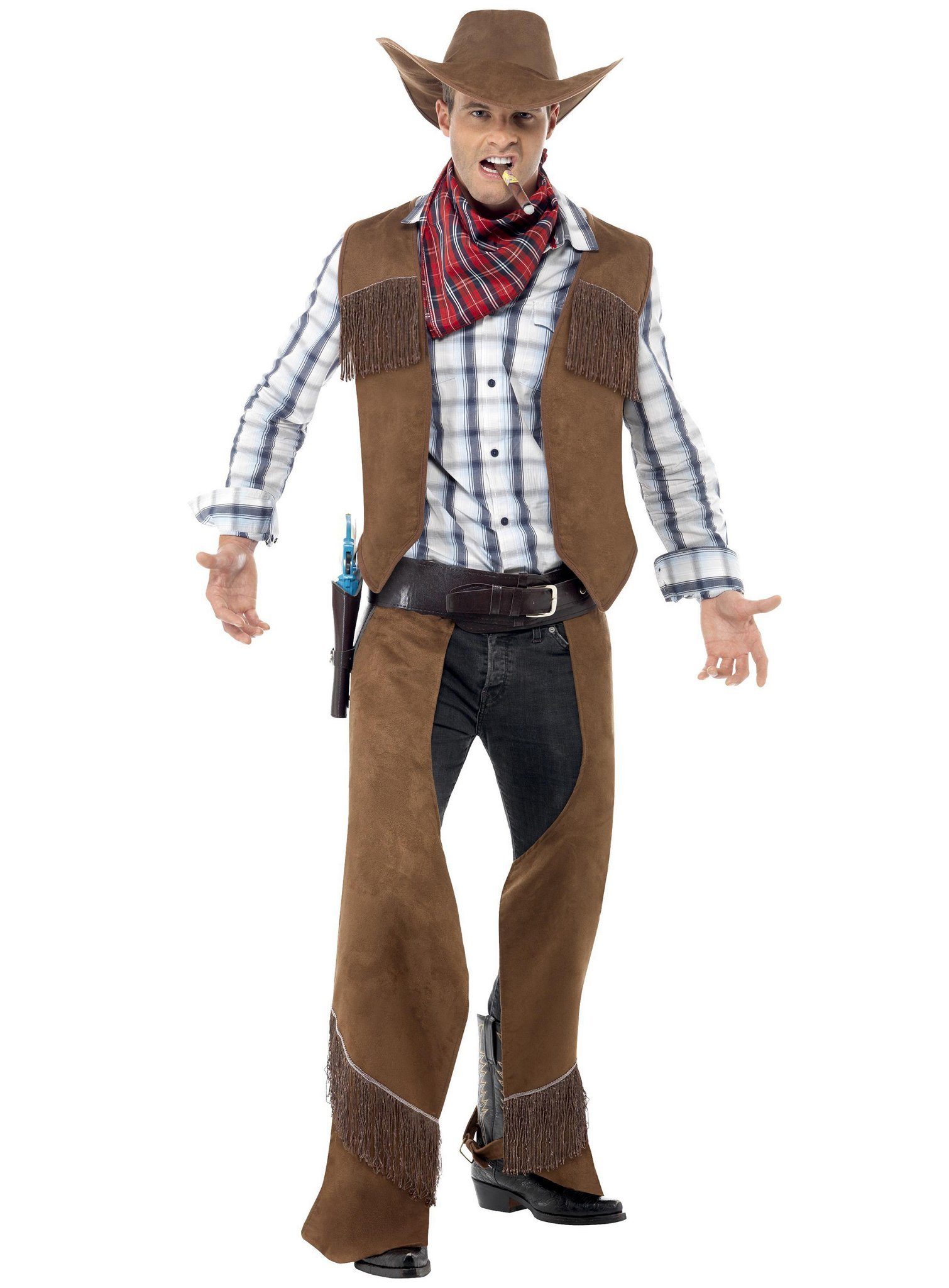 Ausstattung | - Revolverheld Westernkostüm vierteilig- mit Weste- mit Chaps-Hose- mit Halstuch- mit Cowboyhut- ohne Hemd und Jeans |