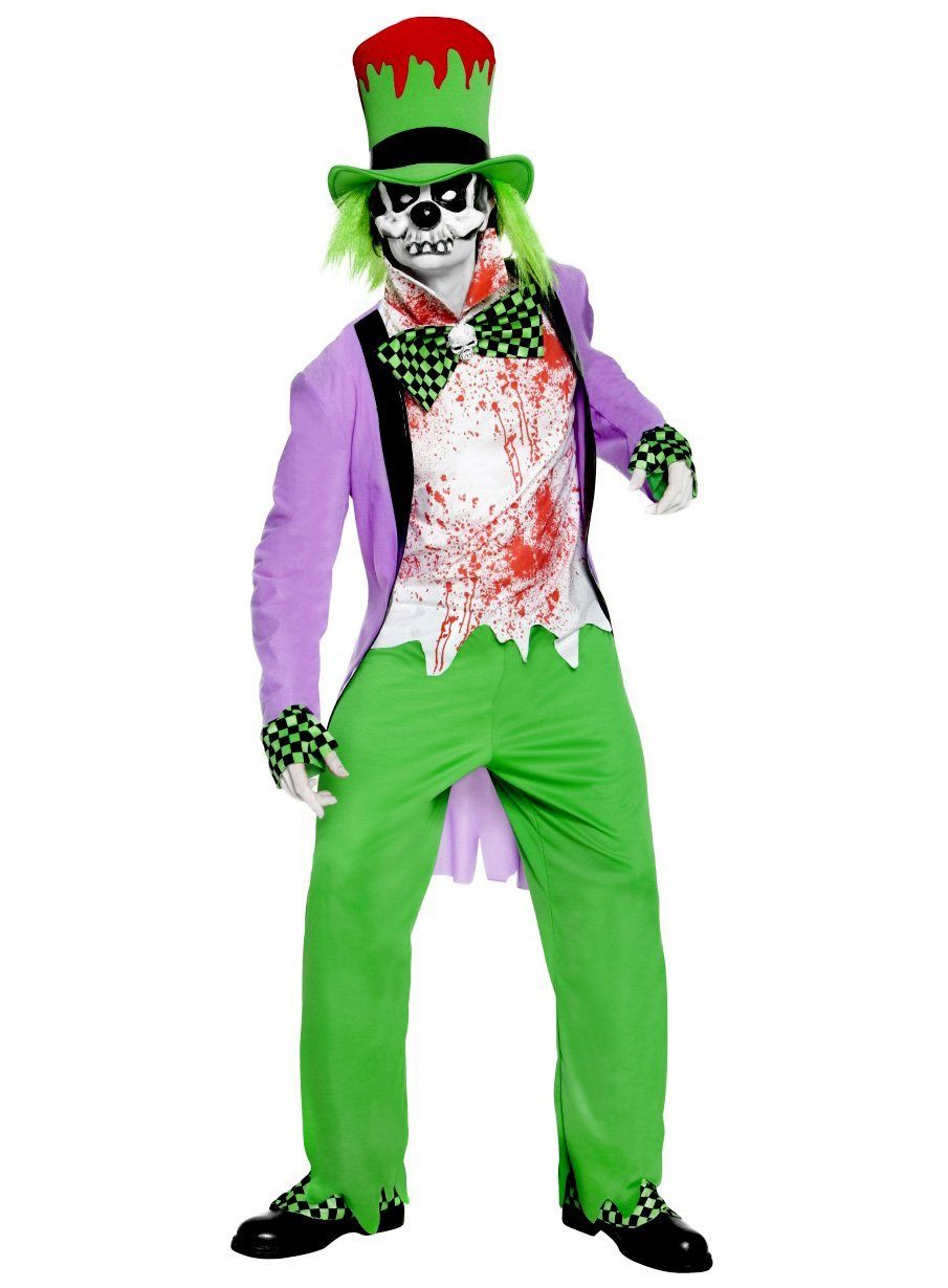 Ein Gummizug hält die knallgrüne Hose an Ort und Stelle. Die Jacke besteht aus lilafarbenem Stoff und ist an den Säumen mit schwarzglänzenden Akzenten verziert. Raffiniert: Die Hemdsbrust wird im hinteren Kragenbereich mit einem Klettverschluss geschlossen und mittels zweier Gummizüge an Eurem Oberkörper befestigt. Knallrote Blutflecken auf dem weißen Stoff und eine Fliege mit Totenkopf-Detail bringen ordentlich Horror-Feeling in dieses kreative Kostüm. Mit der handbemalten, totenkopfähnlichen Halbmaske aus Latex, die ebenfalls mit einem Gummizug befestigt wird, bekommt Euer Gesicht den passend fiesen Wahnsinns-Blick.